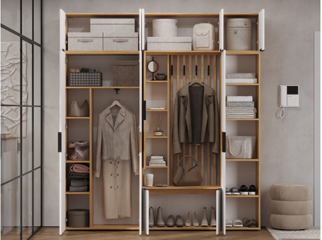 Прихожая Сандра Макси предлагает множество мест для хранения предметов гардероба, обуви и различных мелочей. В распашных шкафах можно аккуратно распределить верхнюю одежду. Открытая секция подойдет для повседневных вещей. Текстура дерева делает интерьер уютнее, а зеркало на одном из фасадов позволяет оценить свой внешний вид перед выходом из дома.