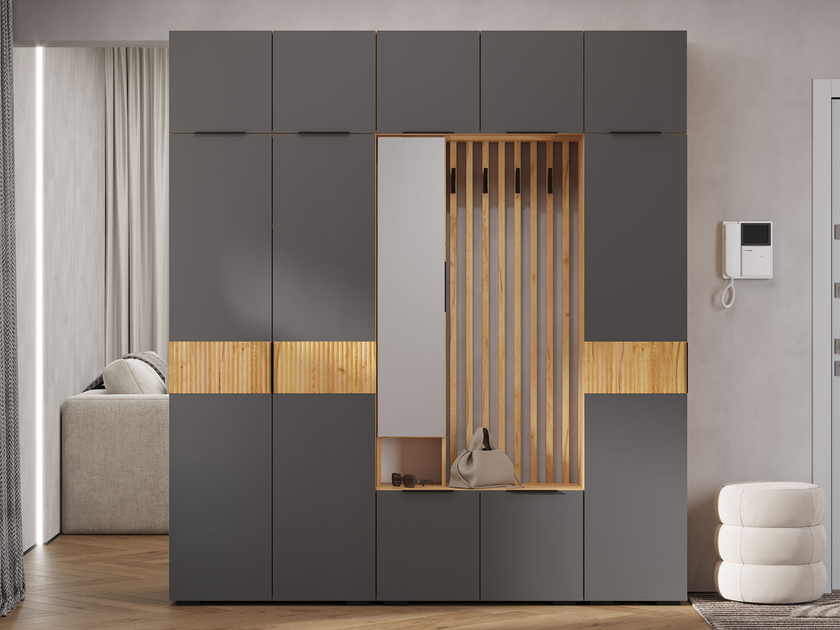 Прихожая Сандра Макси предлагает множество мест для хранения предметов гардероба, обуви и различных мелочей. В распашных шкафах можно аккуратно распределить верхнюю одежду. Открытая секция подойдет для повседневных вещей. Текстура дерева делает интерьер уютнее, а зеркало на одном из фасадов позволяет оценить свой внешний вид перед выходом из дома.