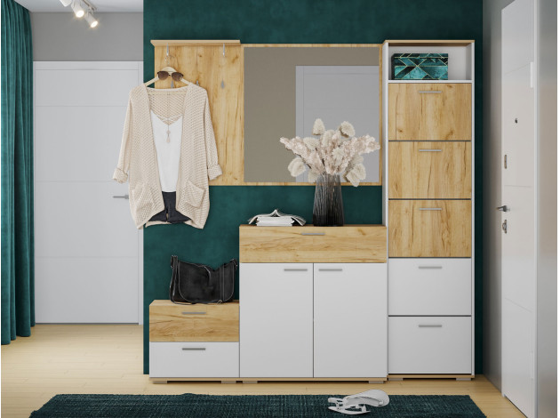 Прихожая Санти включает несколько закрытых модулей для хранения, зеркало и панель с крючками для верхней одежды. Такое оснащение позволяет без труда поддерживать порядок и делает входную зону более комфортабельной. Гармоничное сочетание оттенков и лаконичная фурнитура создают сдержанный и в то же время нескучный экстерьер.