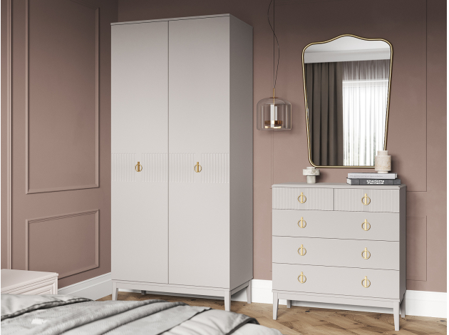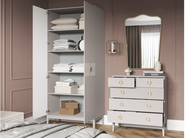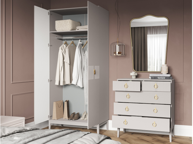 Прихожая Санторини расширит возможности для хранения и придаст интерьеру особый шарм. Распашной шкаф обеспечит место для одежды, постельного белья и объемных коробок. Практичный комод позволит аккуратно хранить домашний текстиль и личные вещи. Оригинальные ручки в оттенке золота привлекают внимание к фасадам с фрезеровкой. Высокие опоры облегчают уборку.