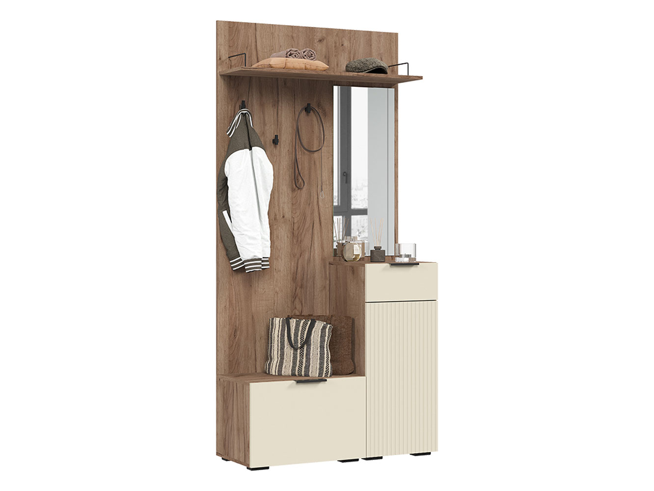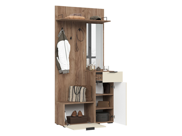 Прихожая Соната Мини создана с акцентом на эстетику и удобный функционал. Наполнение представлено открытыми нишами и тумбами с глухими дверцами, что позволяет аккуратно распределить обувь и аксессуары. Гладкие фасады сочетаются с природными элементами отделки и добавляют интерьеру гармонию и уют. Зеркало помогает оценить внешний вид перед выходом из дома.