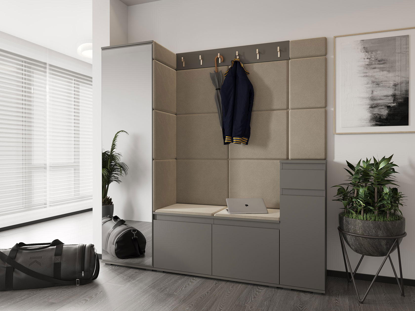 Прихожая Старк поможет обустроить комфортное пространство при входе в квартиру. Практичные элементы обеспечивают место для хранения одежды, обуви, сумок и головных уборов. Мягкие стеновые панели создают уютный акцент. Отсутствие ручек — актуальный мебельный тренд, который станет изюминкой интерьера.