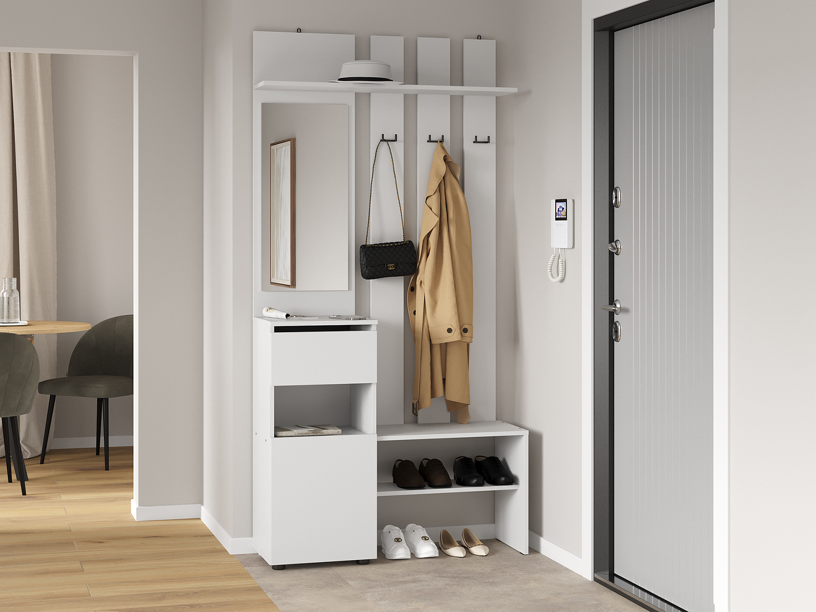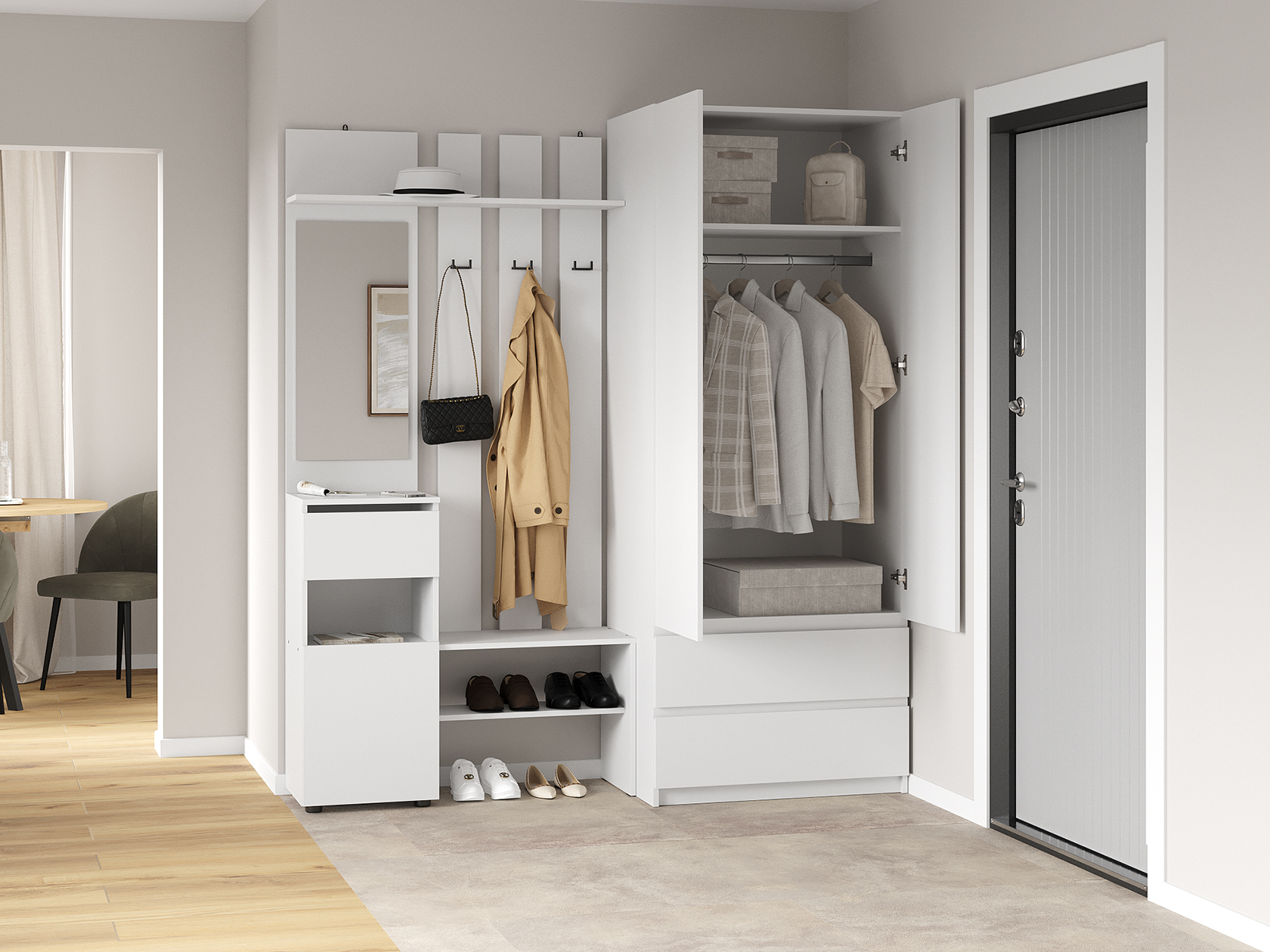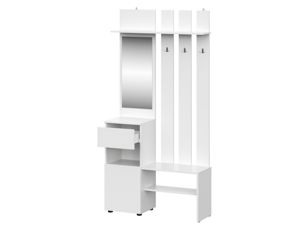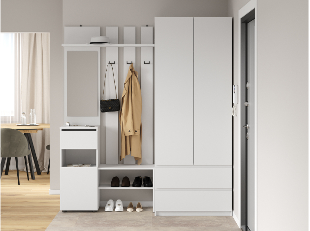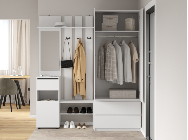 Прихожая Токио поможет аккуратно хранить повседневный гардероб. Внутреннее наполнение представлено двухрожковыми крючками для верхней одежды, широкой полкой для головных уборов, небольшой секцией для обуви, открытой нишей и выдвижным ящиком без внешней фурнитуры, который открывается за край фасада. Зеркало позволит оценить подобранный образ перед выходом из дома.