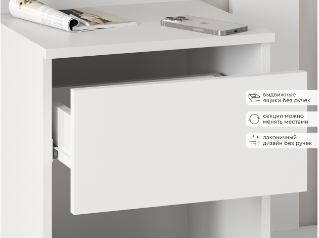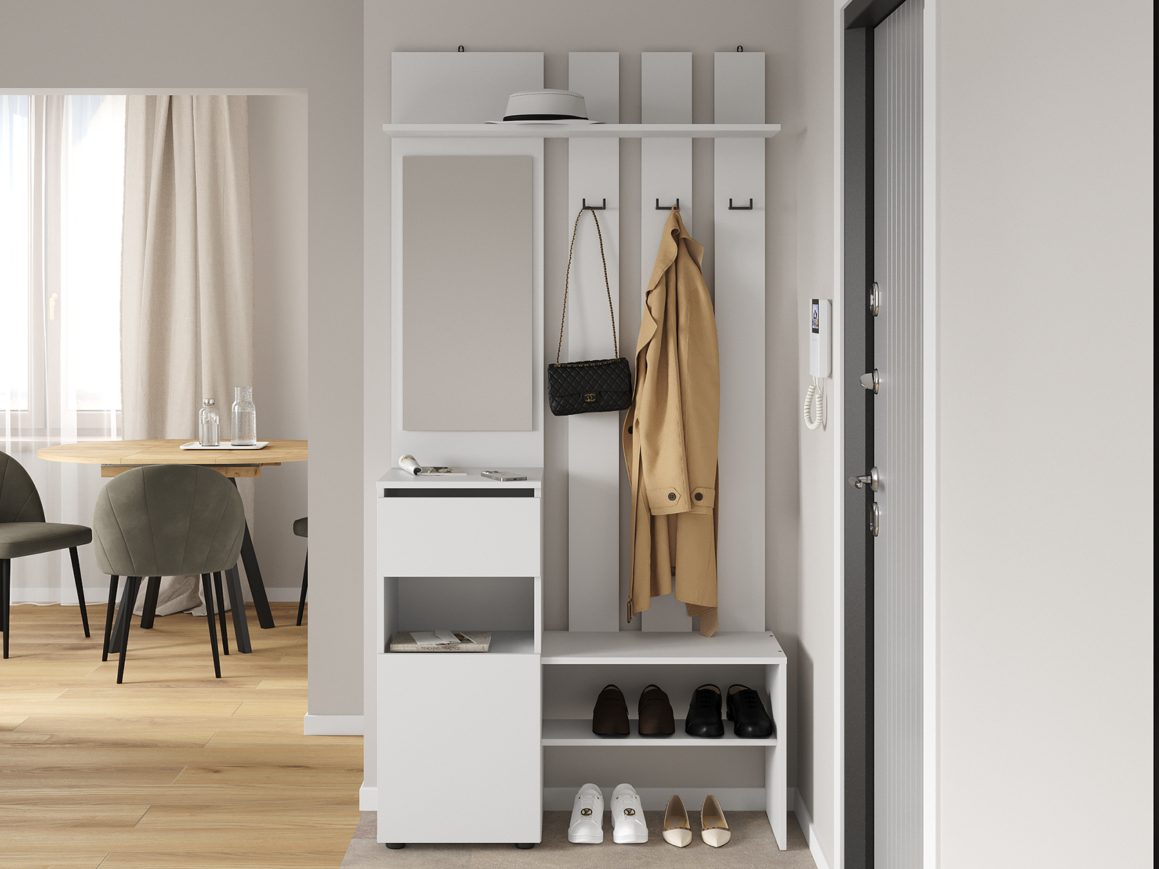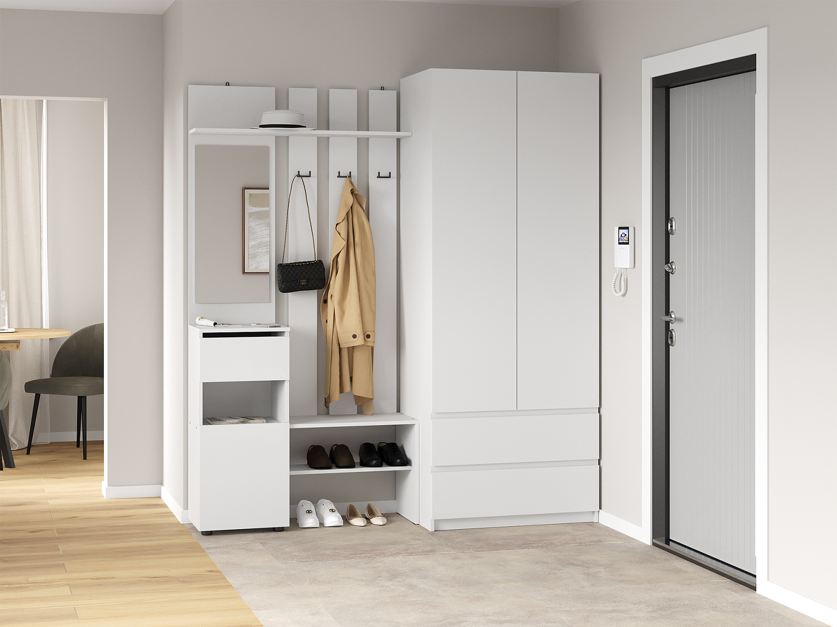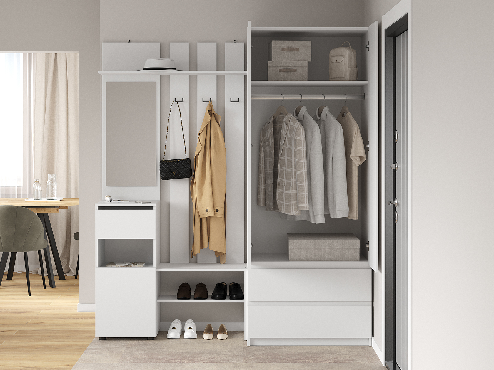 Прихожая Токио поможет аккуратно хранить повседневный гардероб. Внутреннее наполнение представлено двухрожковыми крючками для верхней одежды, широкой полкой для головных уборов, небольшой секцией для обуви, открытой нишей и выдвижным ящиком без внешней фурнитуры, который открывается за край фасада. Зеркало позволит оценить подобранный образ перед выходом из дома.