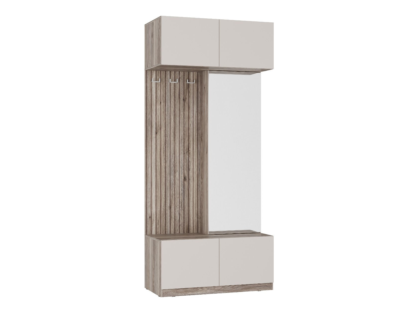 Угловая прихожая Урбан поможет аккуратно хранить как повседневные, так и сезонные одежду, обувь и аксессуары. Открытая вешалка с крючками подходит для курток и пальто, а в распашных шкафах найдется место другим предметам гардероба. Зеркало добавляет входной зоне пространства и света. Гладкие матовые фасады с фактурой дерева гармонично дополняют интерьер.