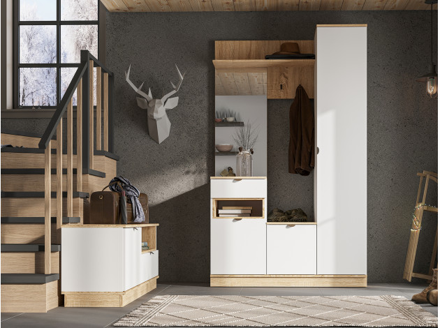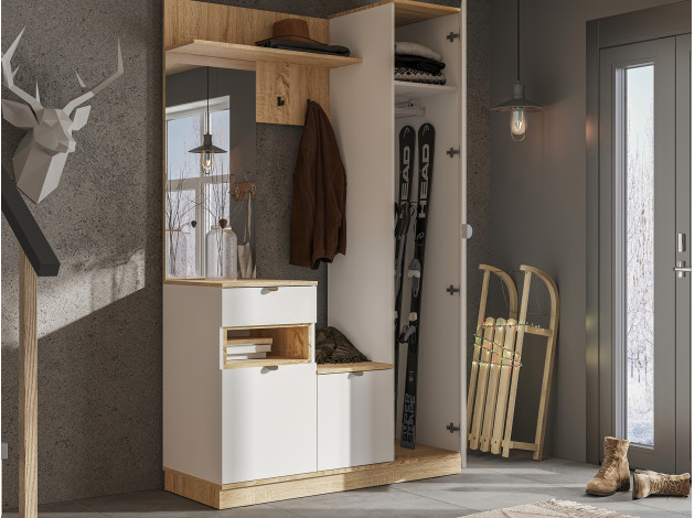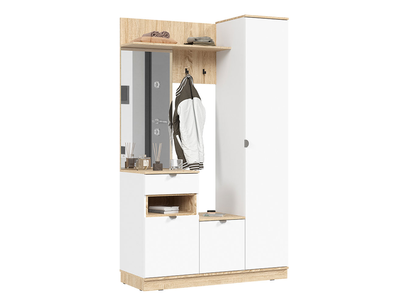 Прихожая Юкка — компактное и стильное решение для меблировки входной группы. Вешалка с крючками позволяет аккуратно разместить верхнюю одежду. Распашной шкаф со штангой поможет хранить сезонные предметы гардероба, а обувницы освободят место на полу. Для ключей, аксессуаров и разных мелочей есть небольшой ящик.