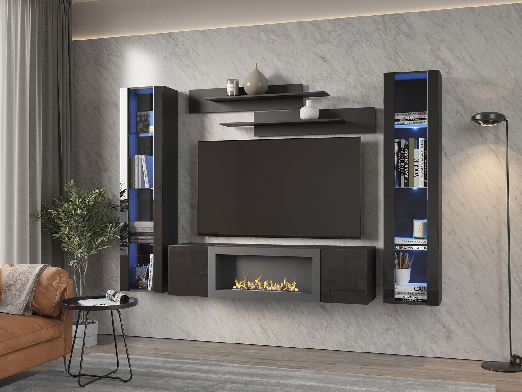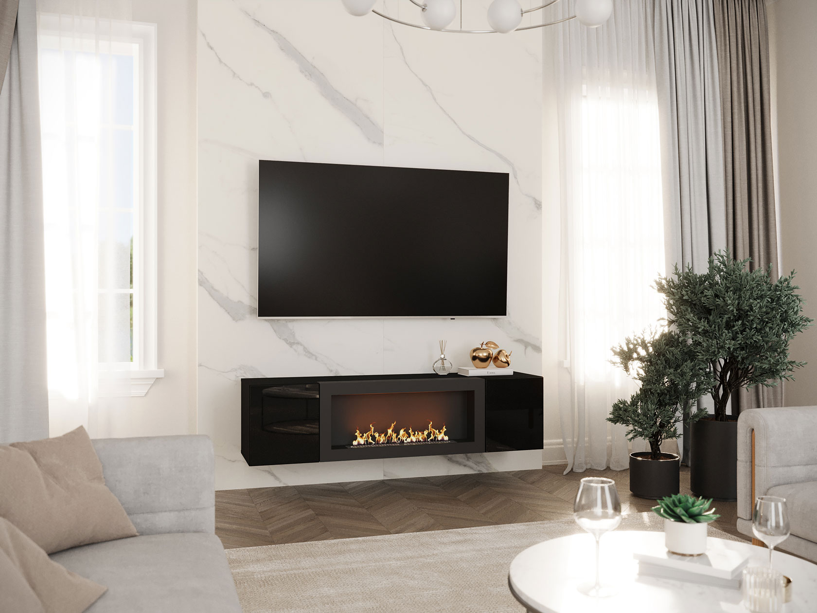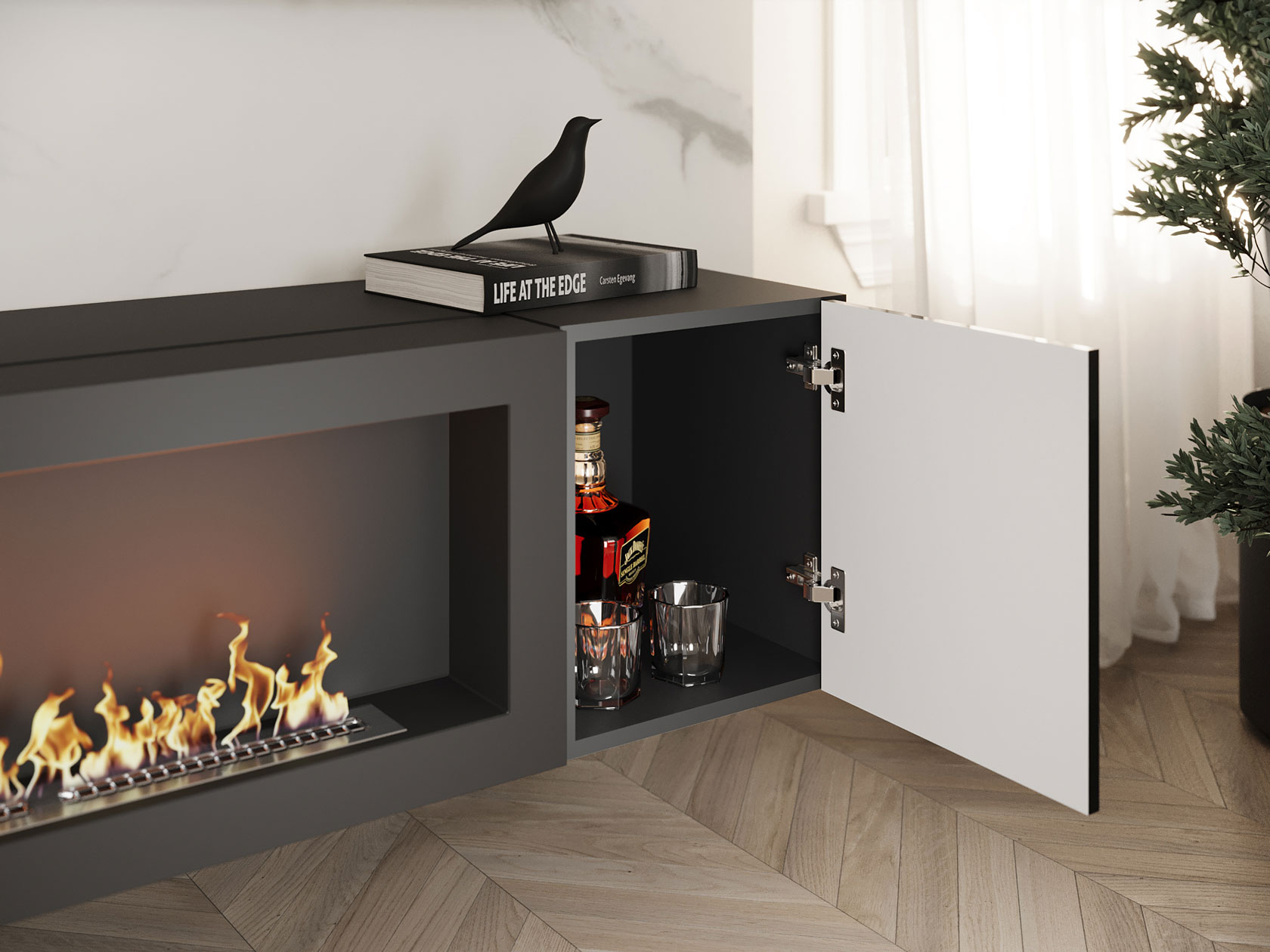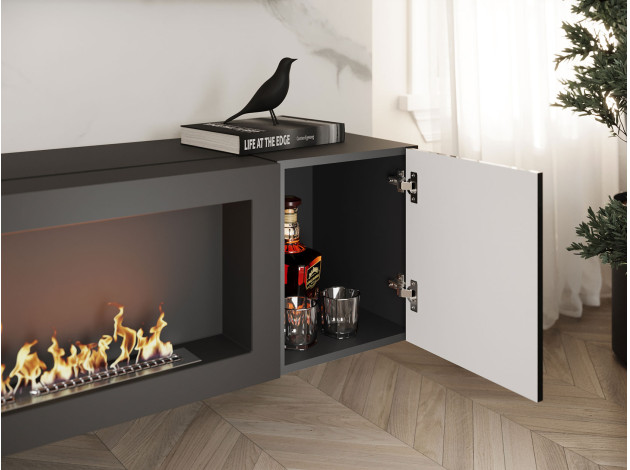 Навесной шкаф с биокамином Поинт станет оригинальным украшением интерьера. Нетривиальный элемент привнесет в привычную обстановку нотки тепла и уюта, словно в комнате действительно зажегся гостеприимный костер. Модель может выступить как самостоятельным элементом интерьера, так и составной частью одноименной гостиной.