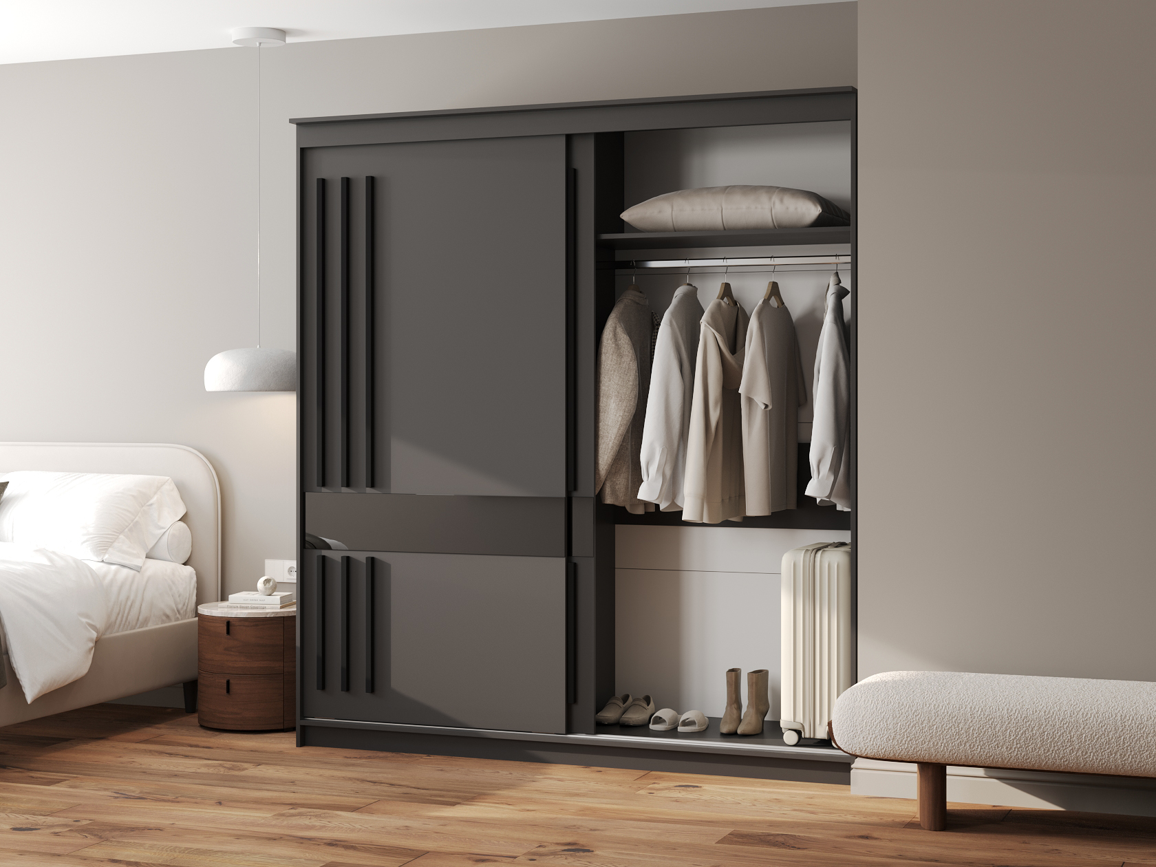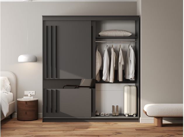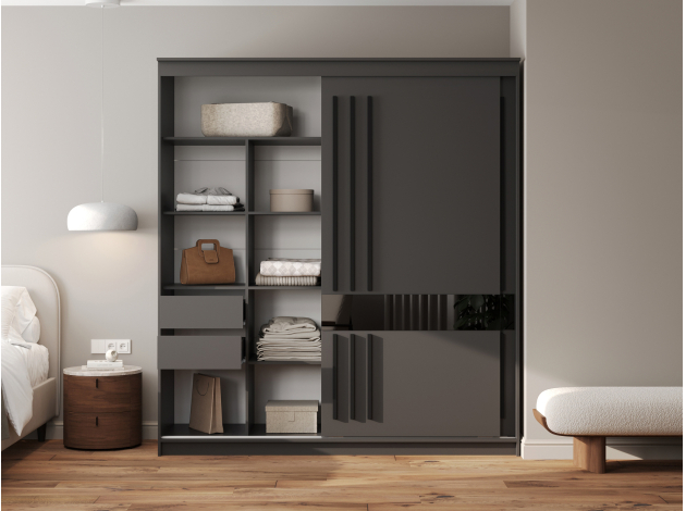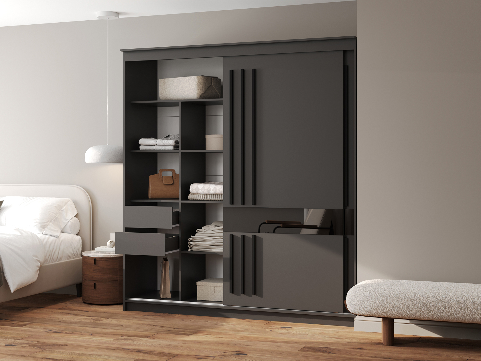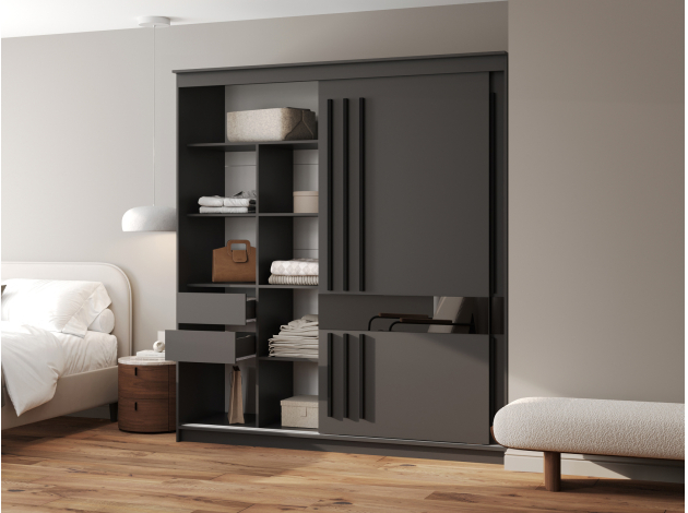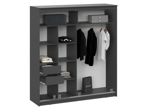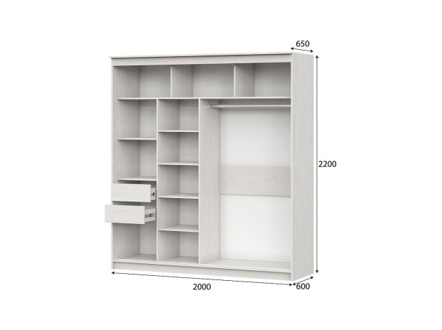 Шкаф-купе Колор представляет собой функциональную систему хранения повседневных и сезонных вещей. Для аккуратного развешивания предметов гардероба предусмотрена вместительная ниша со штангой для вешалок, а для постельного белья и одежды из немнущихся тканей имеется отделение с полками. Небольшие выдвижные ящики будут удобны для аксессуаров и других вещей.