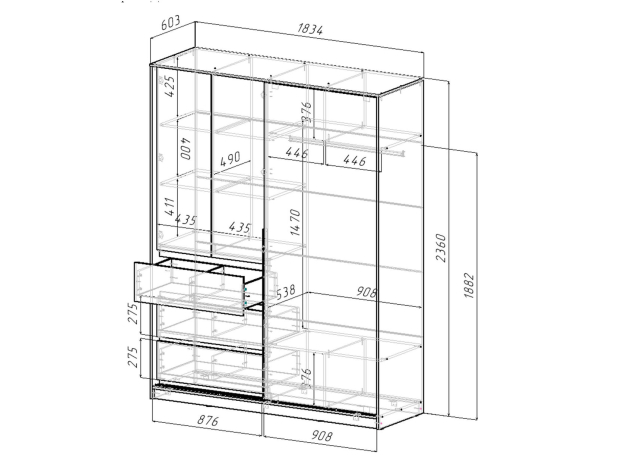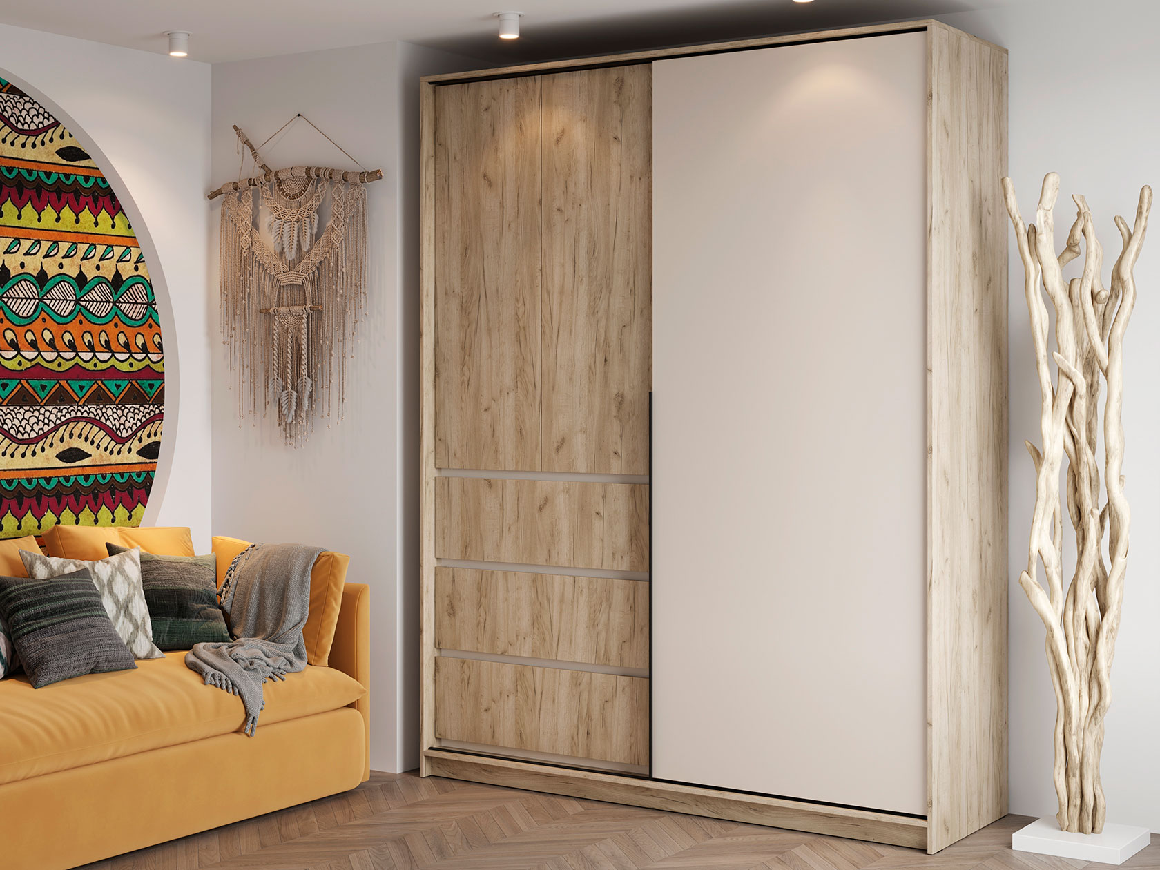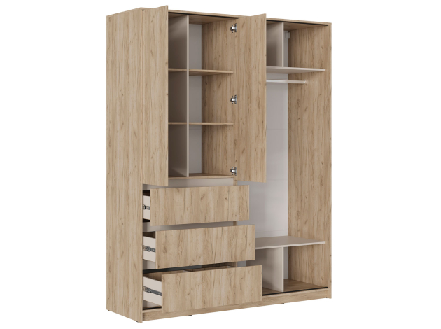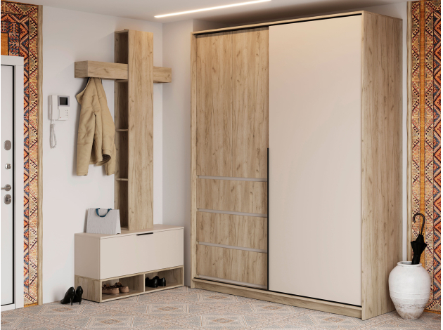 Шкаф-купе Бохо позволит создать продуманную систему хранения одежды в современном интерьере. Внутреннее наполнение включает два отделения с полками для сложенных вещей и штангу для вешалок. Антресольную часть можно использовать для головных уборов. Раздвижные двери помогают сэкономить место в комнате.