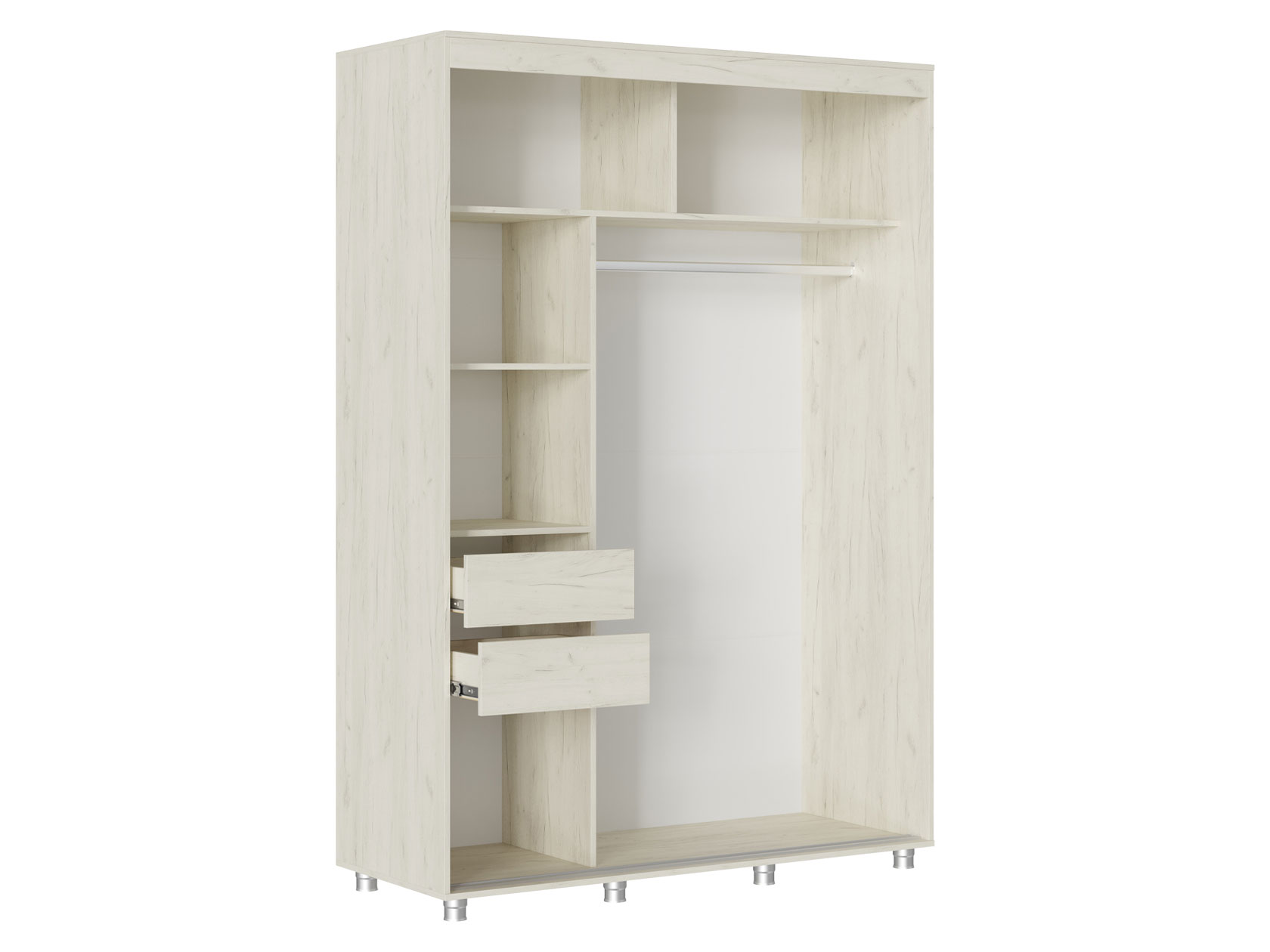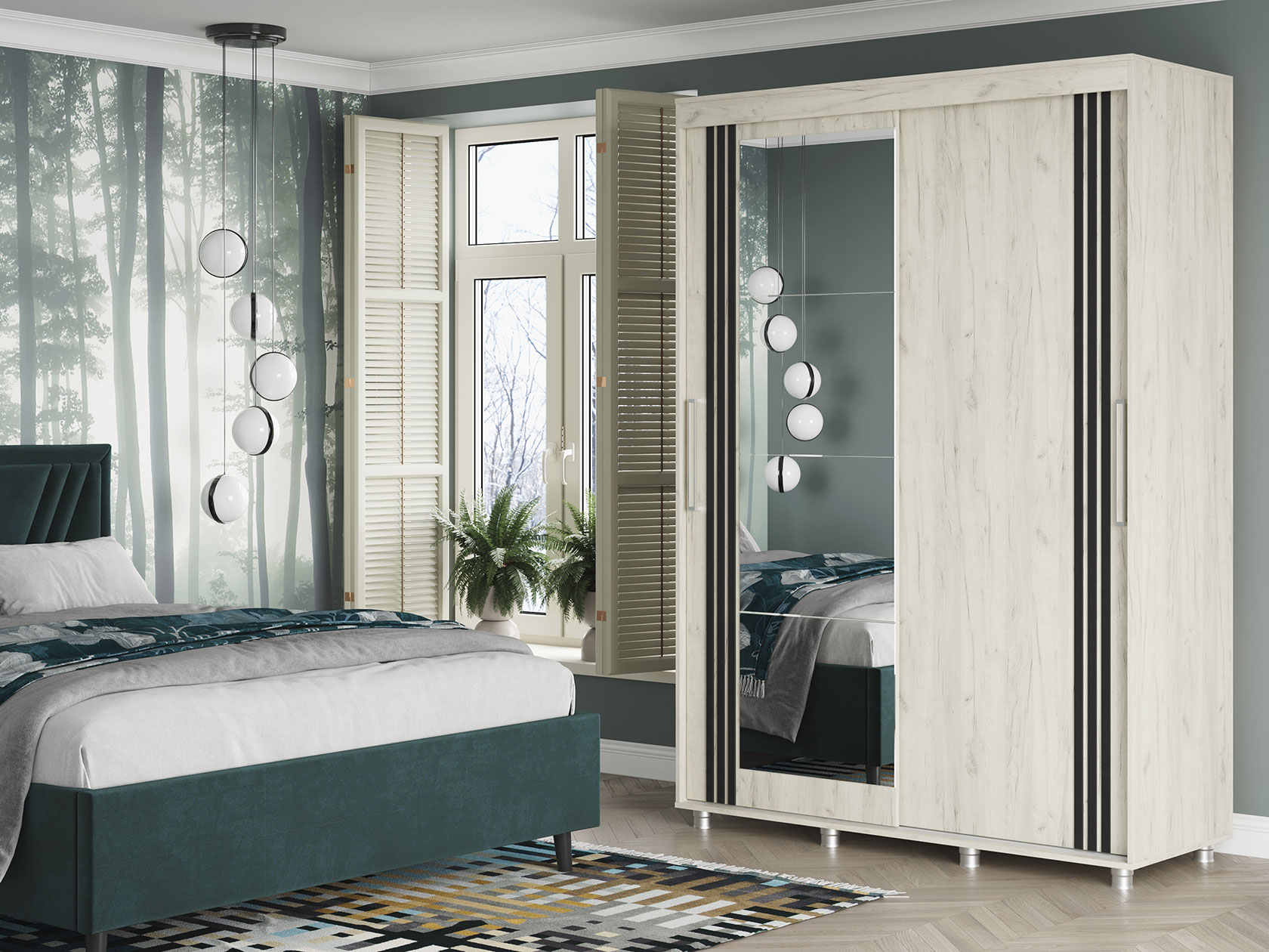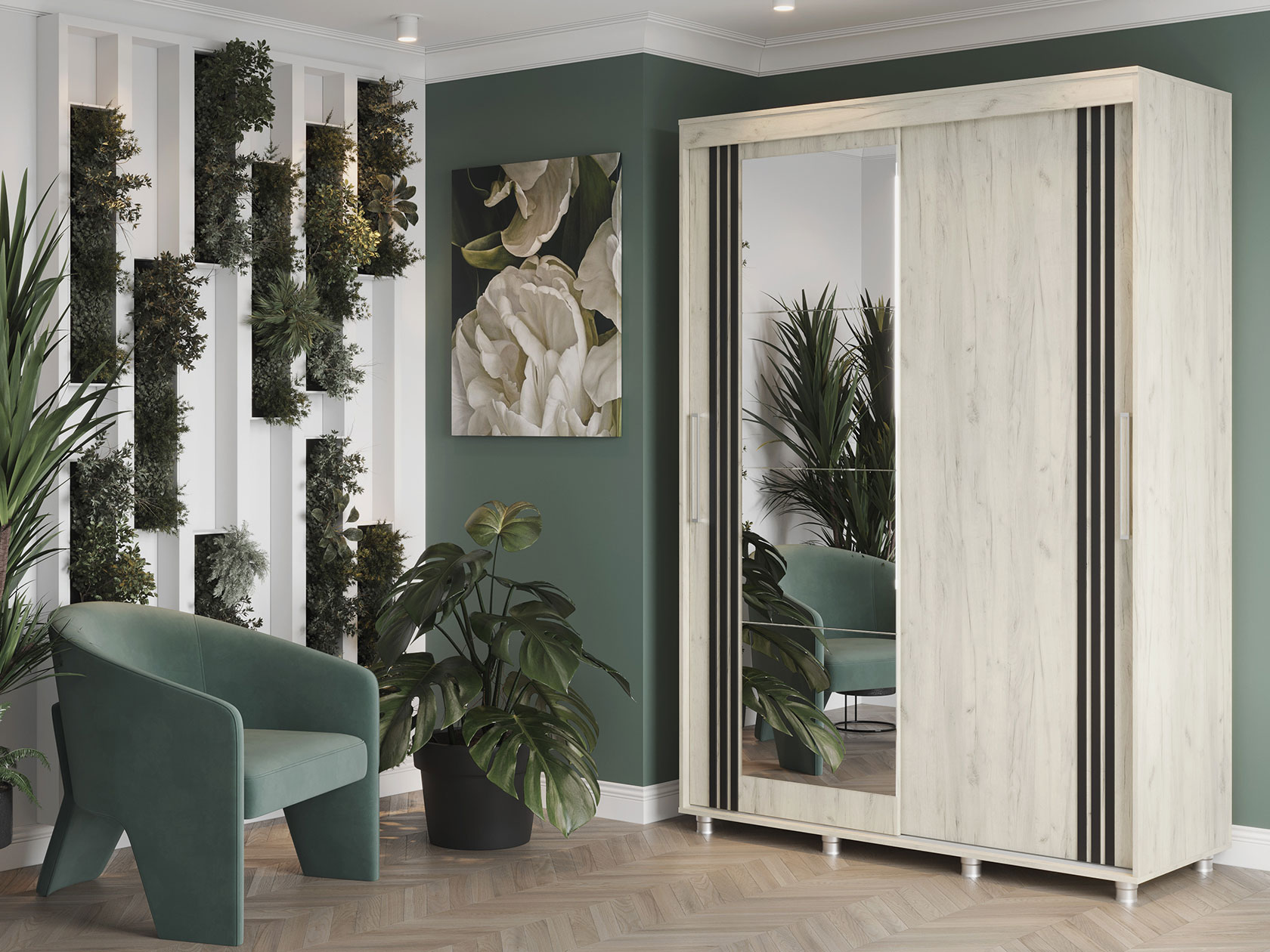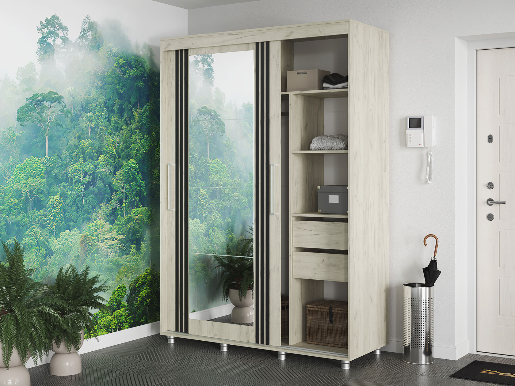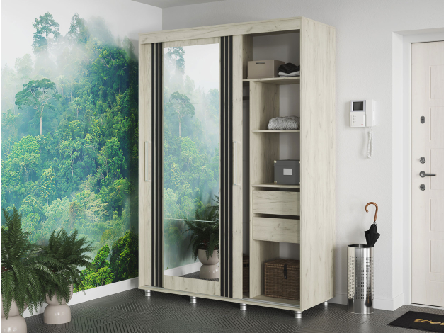 Шкаф-купе Форест поможет организовать полноценную систему хранения в спальне, гостиной или прихожей. Внутреннее наполнение состоит из секций со штангой и полками, выдвижных ящиков и антресольных ниш. Такое разнообразие позволяет удобно разместить любые предметы гардероба. Раздвижные двери открываются плавно и бесшумно. Зеркало визуально расширяет пространство, а декор в виде вертикальных линий подчеркивает строгий силуэт мебели.
