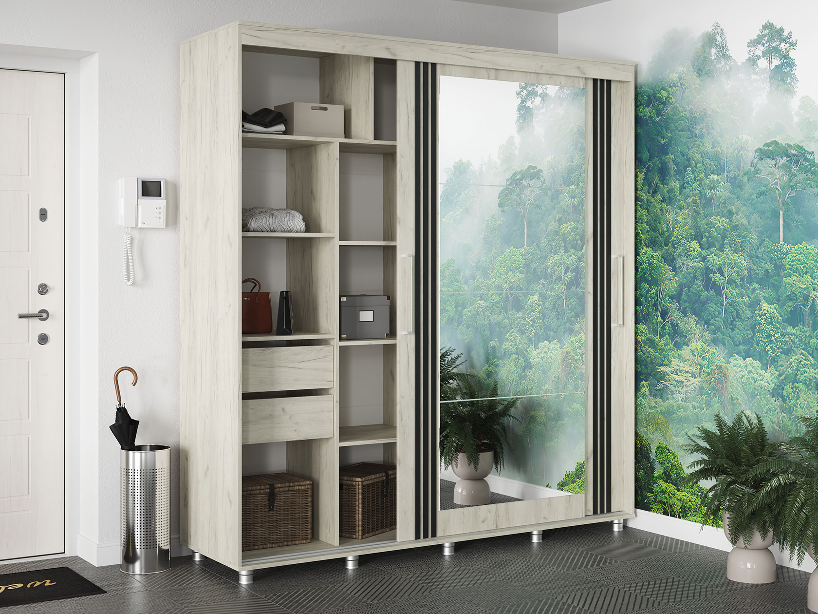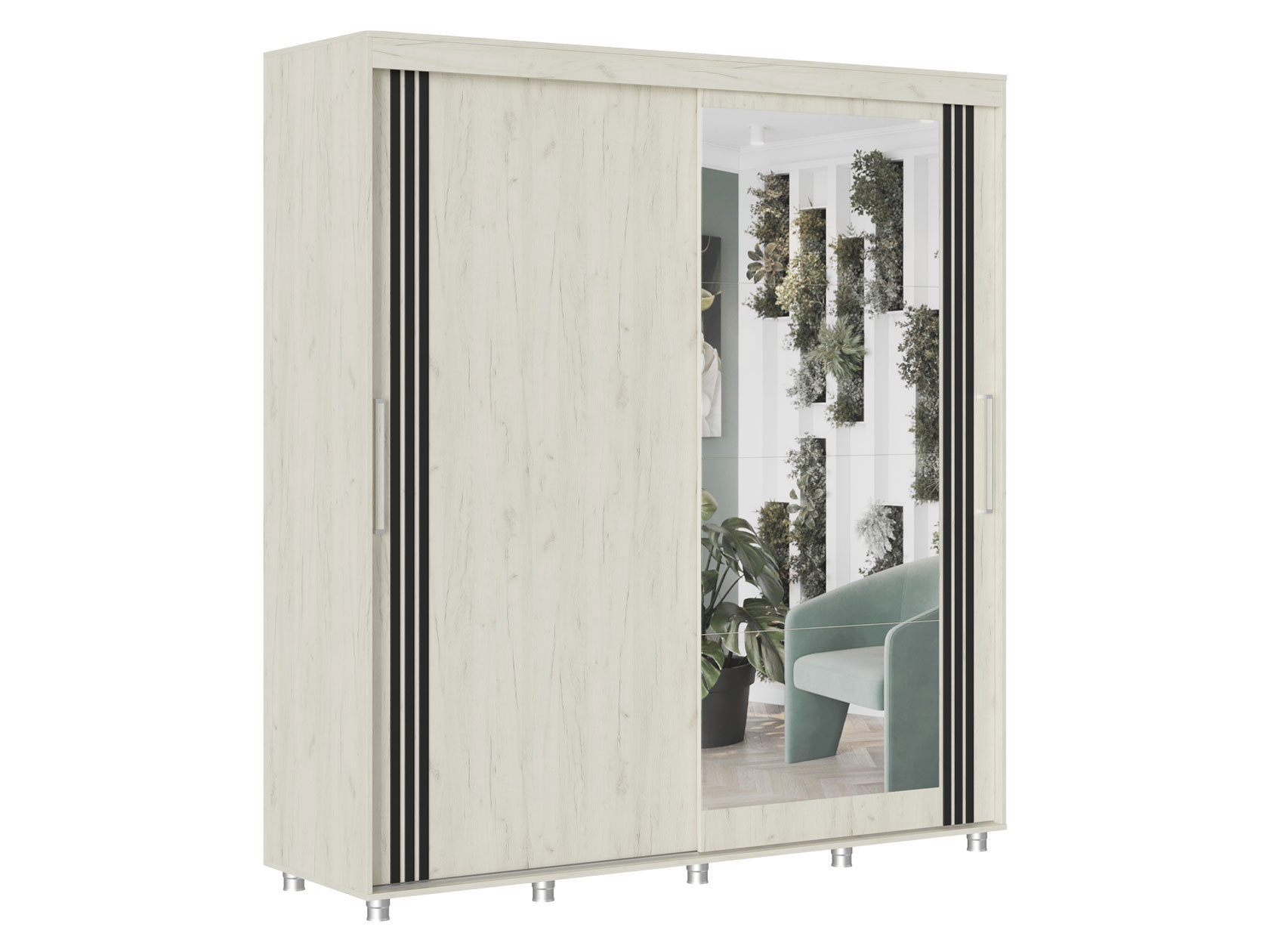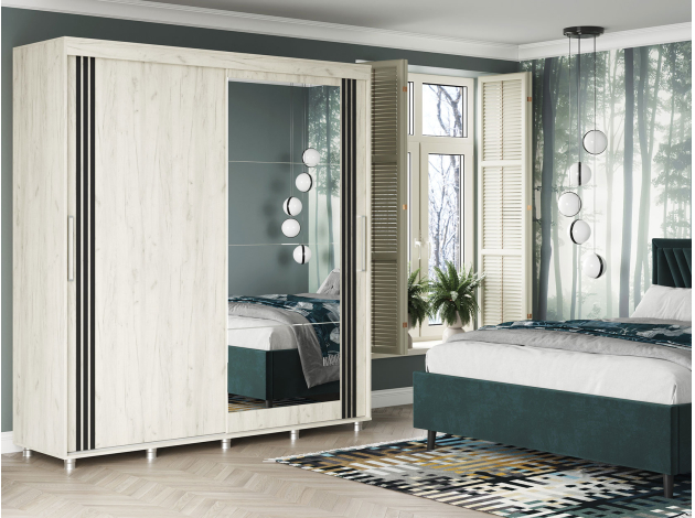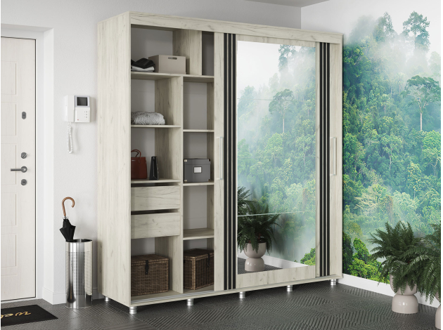 Шкаф-купе Форест поможет организовать полноценную систему хранения в спальне, гостиной или прихожей. Внутреннее наполнение состоит из секций со штангой и полками, выдвижных ящиков и антресольных ниш. Такое разнообразие позволяет удобно разместить любые предметы гардероба. Раздвижные двери открываются плавно и бесшумно. Зеркало визуально расширяет пространство, а декор в виде вертикальных линий подчеркивает строгий силуэт мебели.