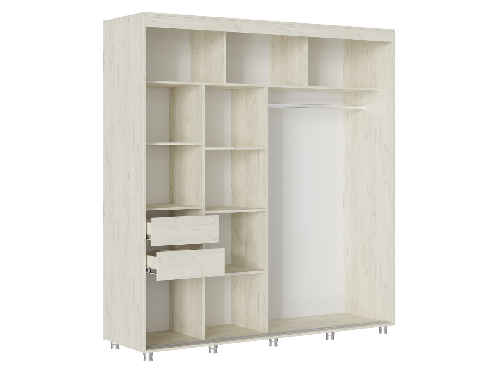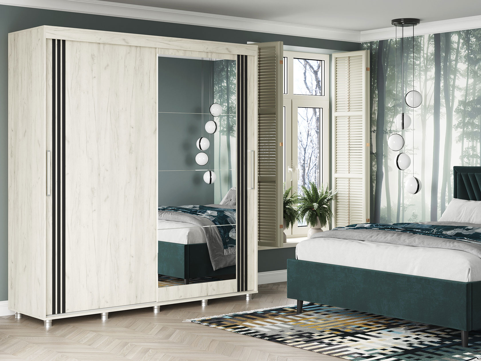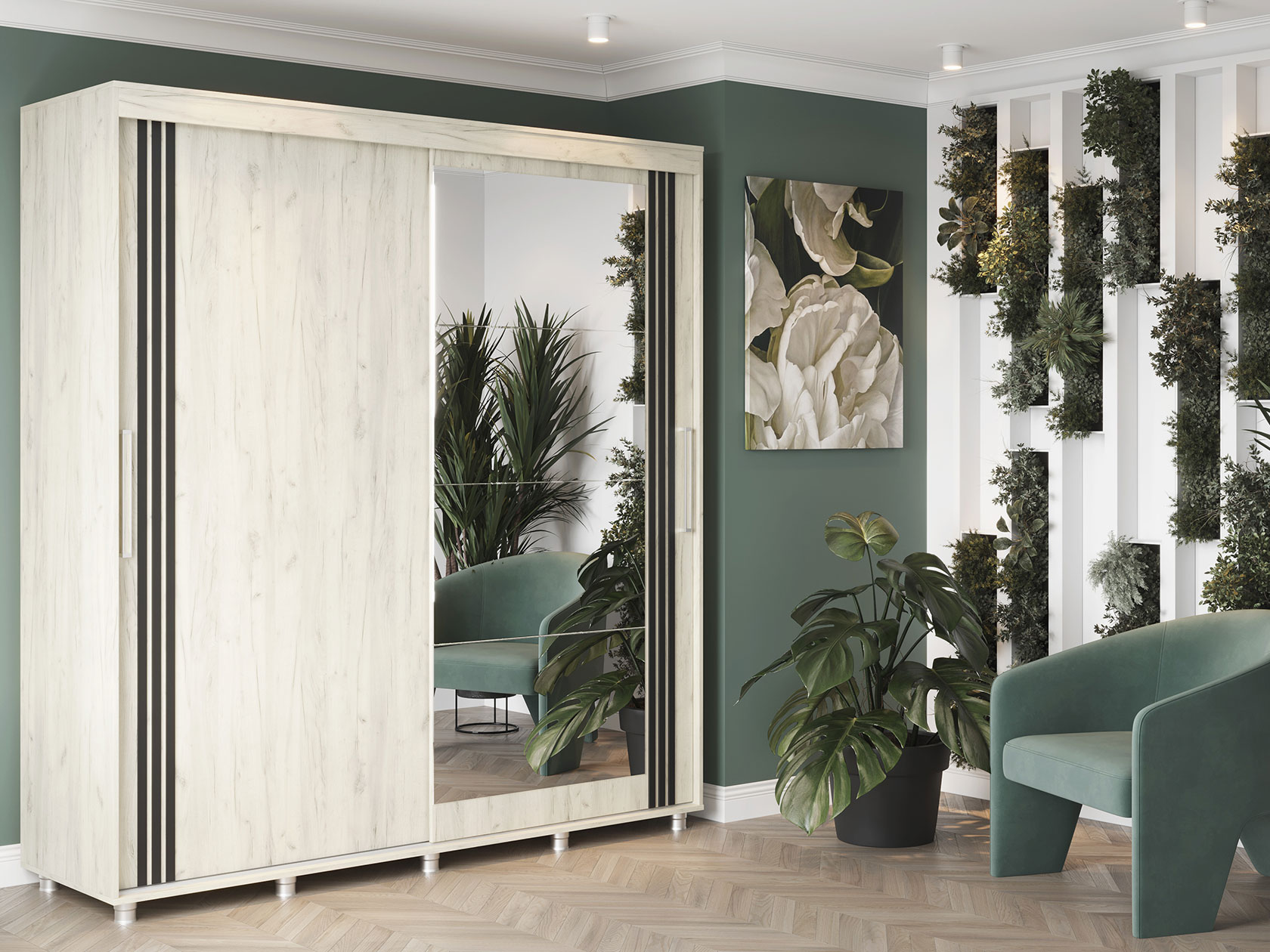 Шкаф-купе Форест поможет организовать полноценную систему хранения в спальне, гостиной или прихожей. Внутреннее наполнение состоит из секций со штангой и полками, выдвижных ящиков и антресольных ниш. Такое разнообразие позволяет удобно разместить любые предметы гардероба. Раздвижные двери открываются плавно и бесшумно. Зеркало визуально расширяет пространство, а декор в виде вертикальных линий подчеркивает строгий силуэт мебели.