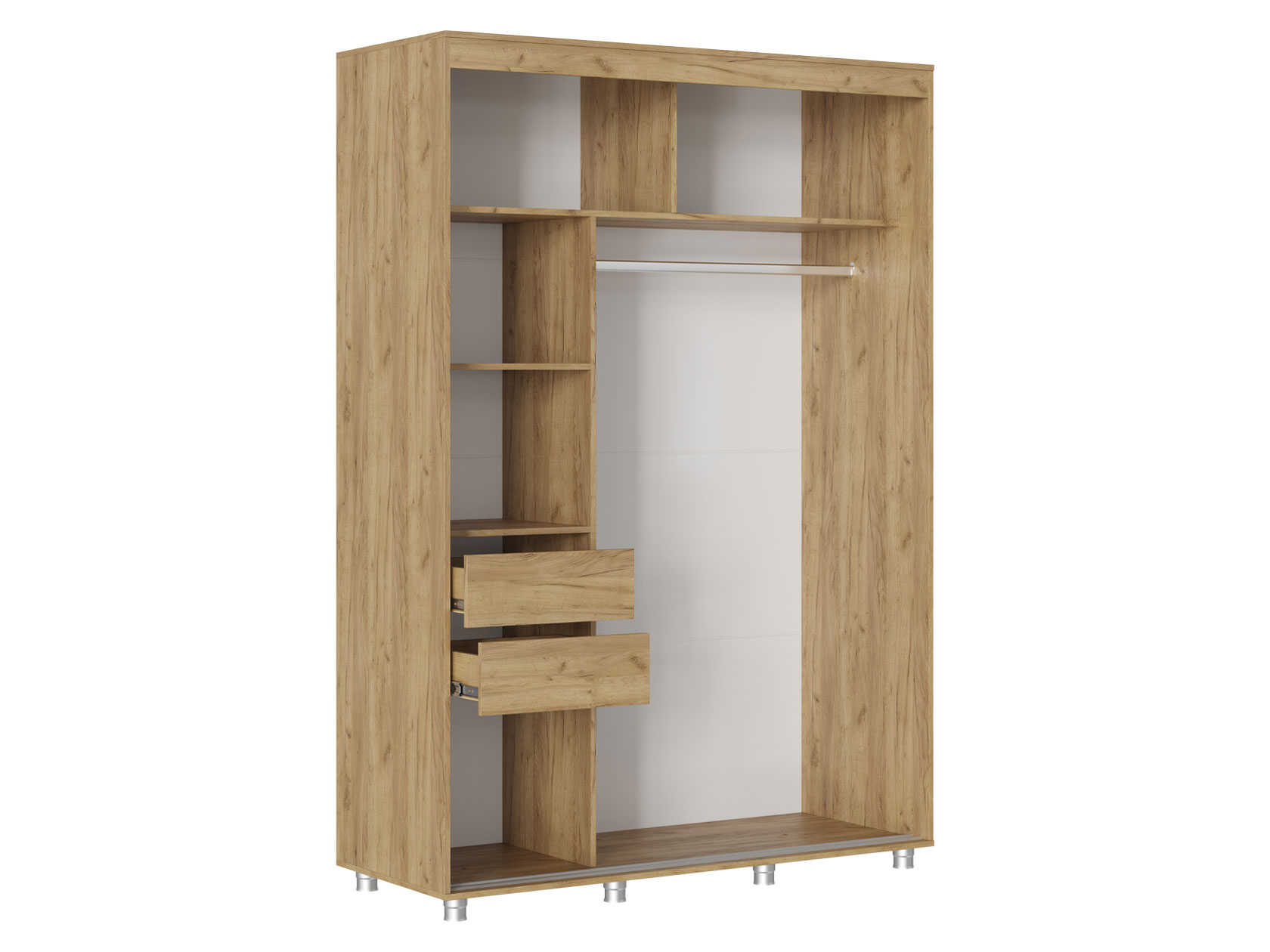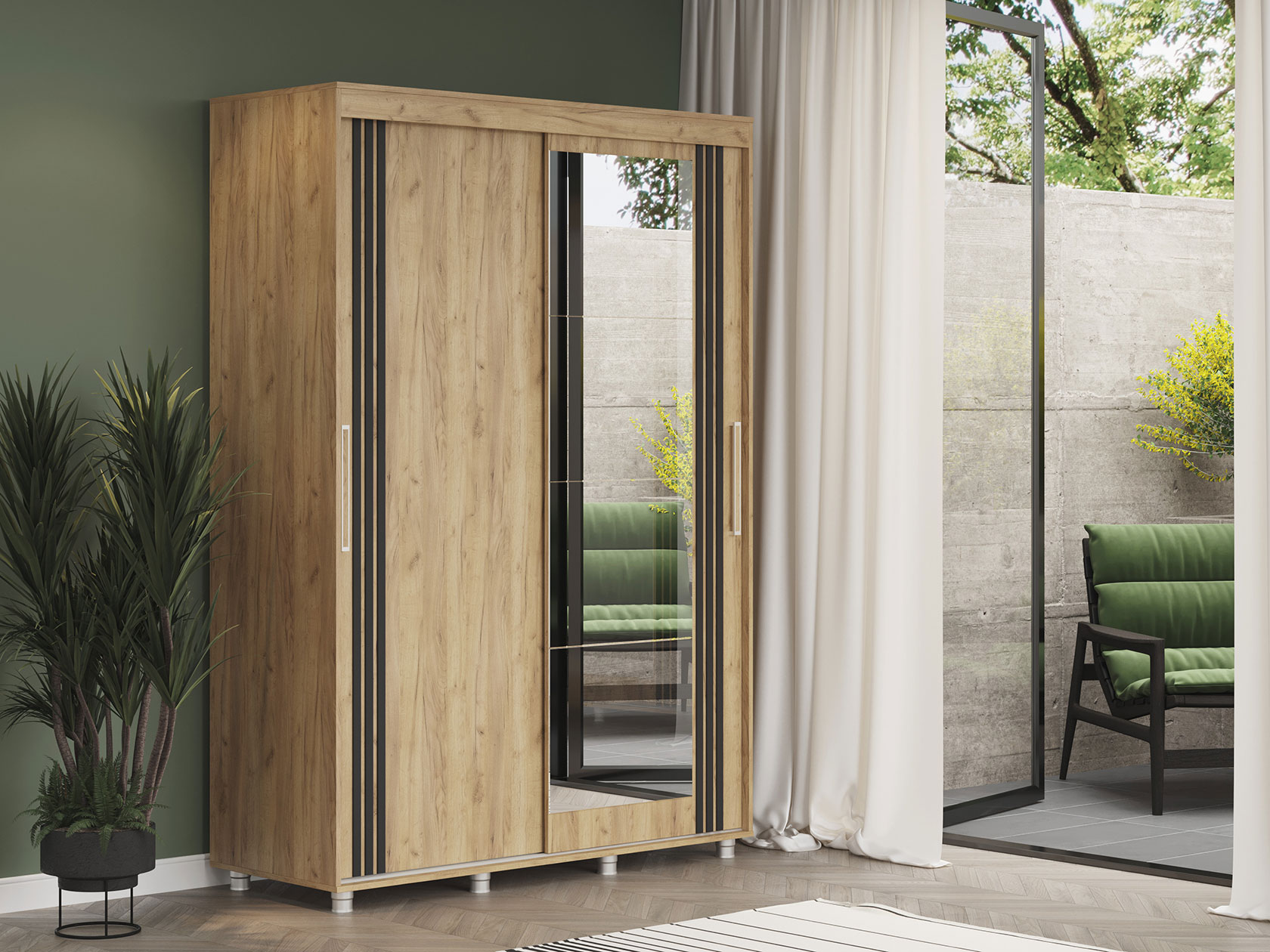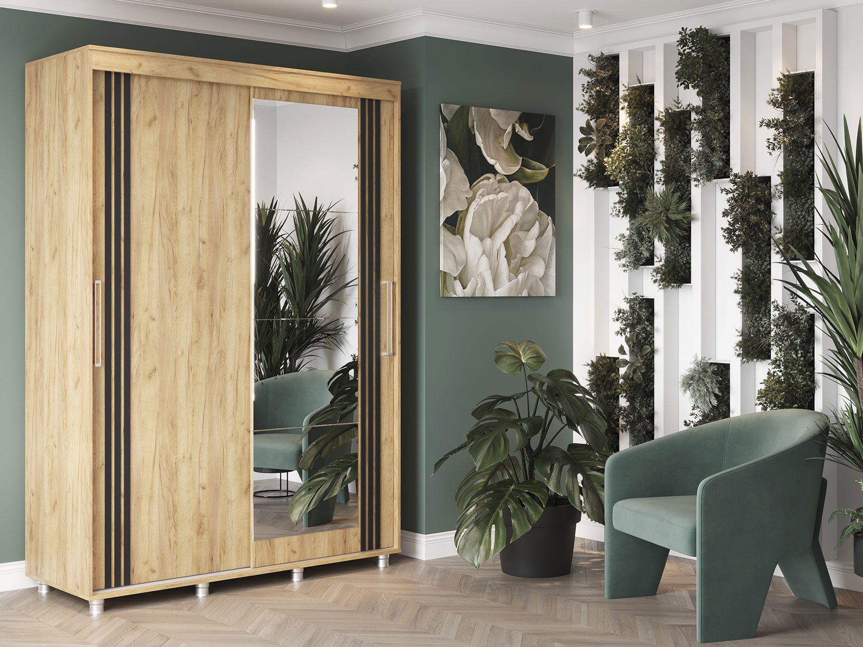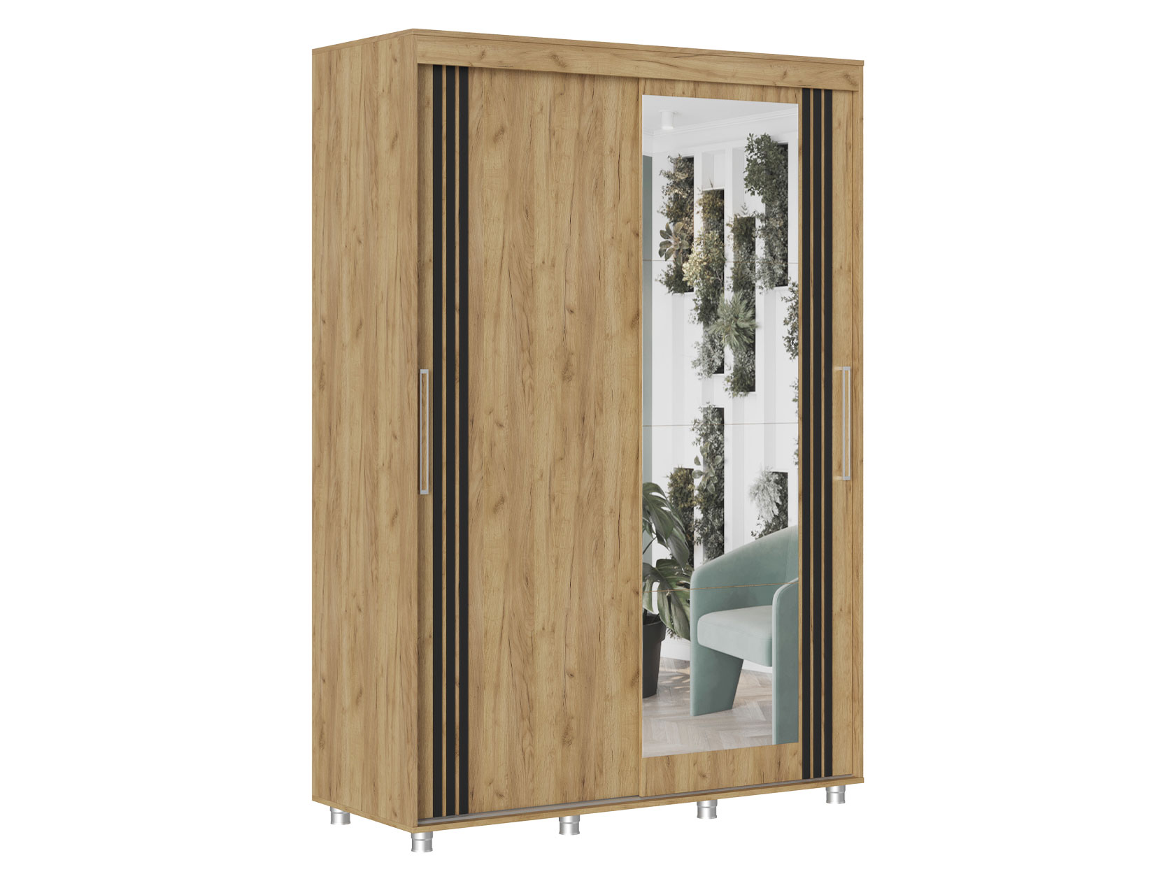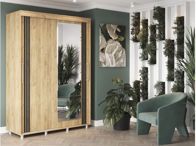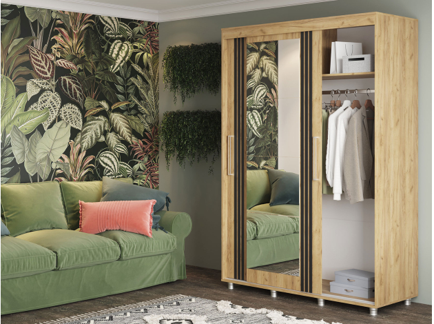 Шкаф-купе Форест поможет организовать полноценную систему хранения в спальне, гостиной или прихожей. Внутреннее наполнение состоит из секций со штангой и полками, выдвижных ящиков и антресольных ниш. Такое разнообразие позволяет удобно разместить любые предметы гардероба. Раздвижные двери открываются плавно и бесшумно. Зеркало визуально расширяет пространство, а декор в виде вертикальных линий подчеркивает строгий силуэт мебели.
