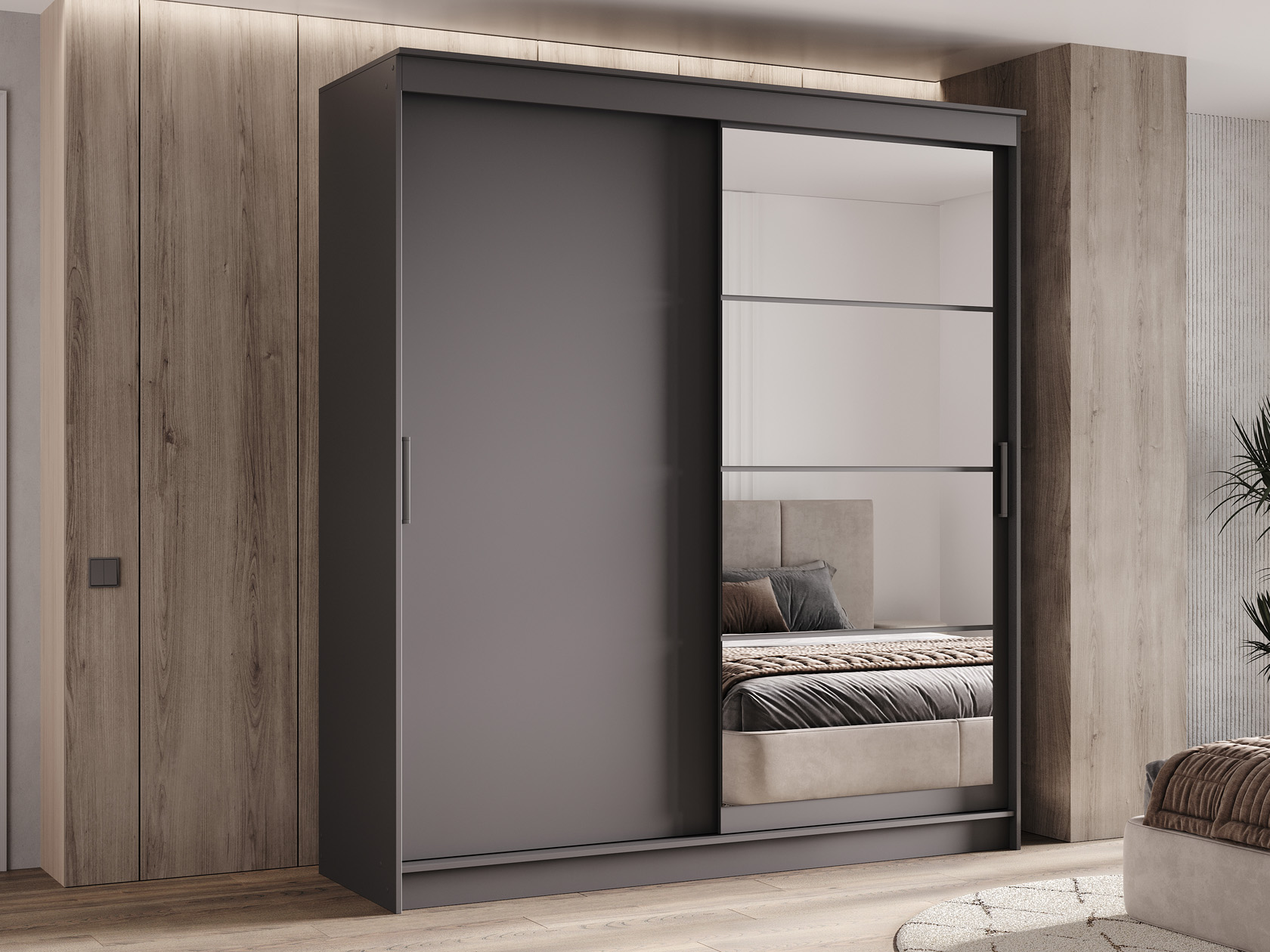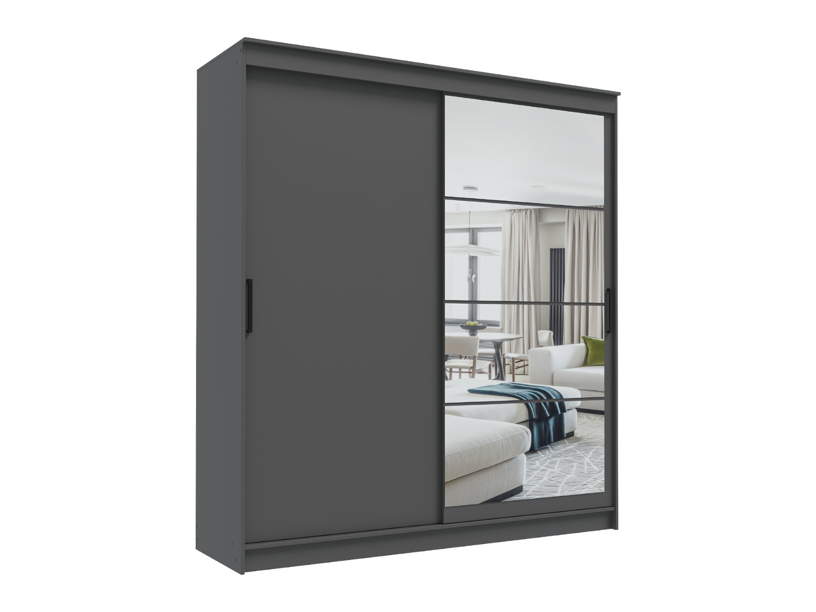 Шкаф-купе Гранд с глухой дверью и зеркалом удачно дополнит интерьер и расширит систему хранения предметов гардероба. Внутреннее наполнение представлено отделением со штангой и удобными полками. Модель оснащена направляющими, которые обеспечивают мягкое и беззвучное скольжение дверей. Гладкий матовый фасад не создаст проблем в уходе, а зеркало в полный рост позволит оценить подобранный образ.