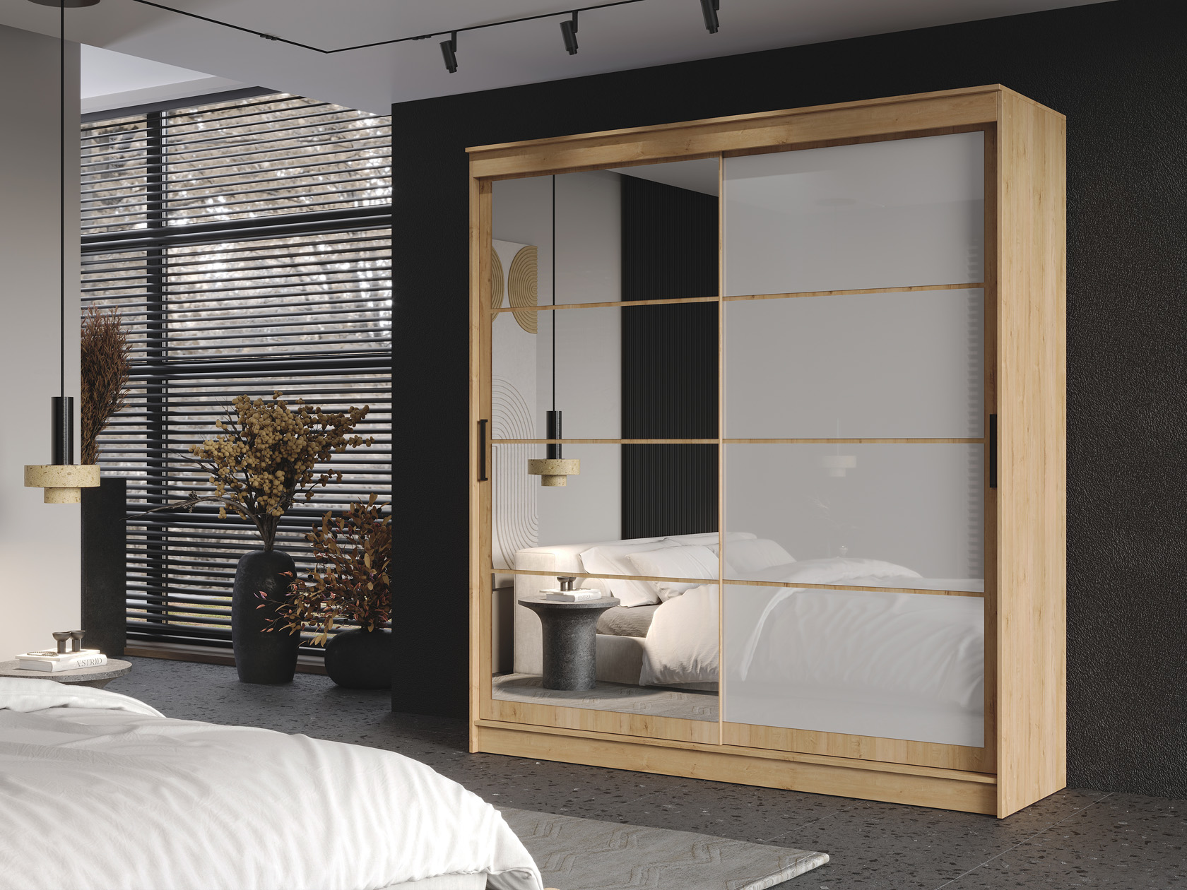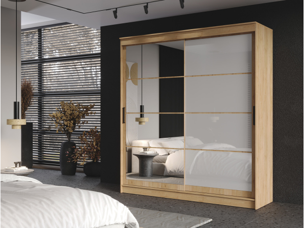Шкаф-купе Гранд с зеркалом и лакобель белым — стильная и функциональная модель с продуманным наполнением. Для мнущихся вещей предусмотрена вместительная ниша со штангой, а для белья и другой повседневной одежды — отделение с полками. Небольшие выдвижные ящики удобны для аксессуаров и различных мелочей. С одной стороны дверца декорирована глянцевым лакобелем белого цвета, что создает необычный акцент интерьера.