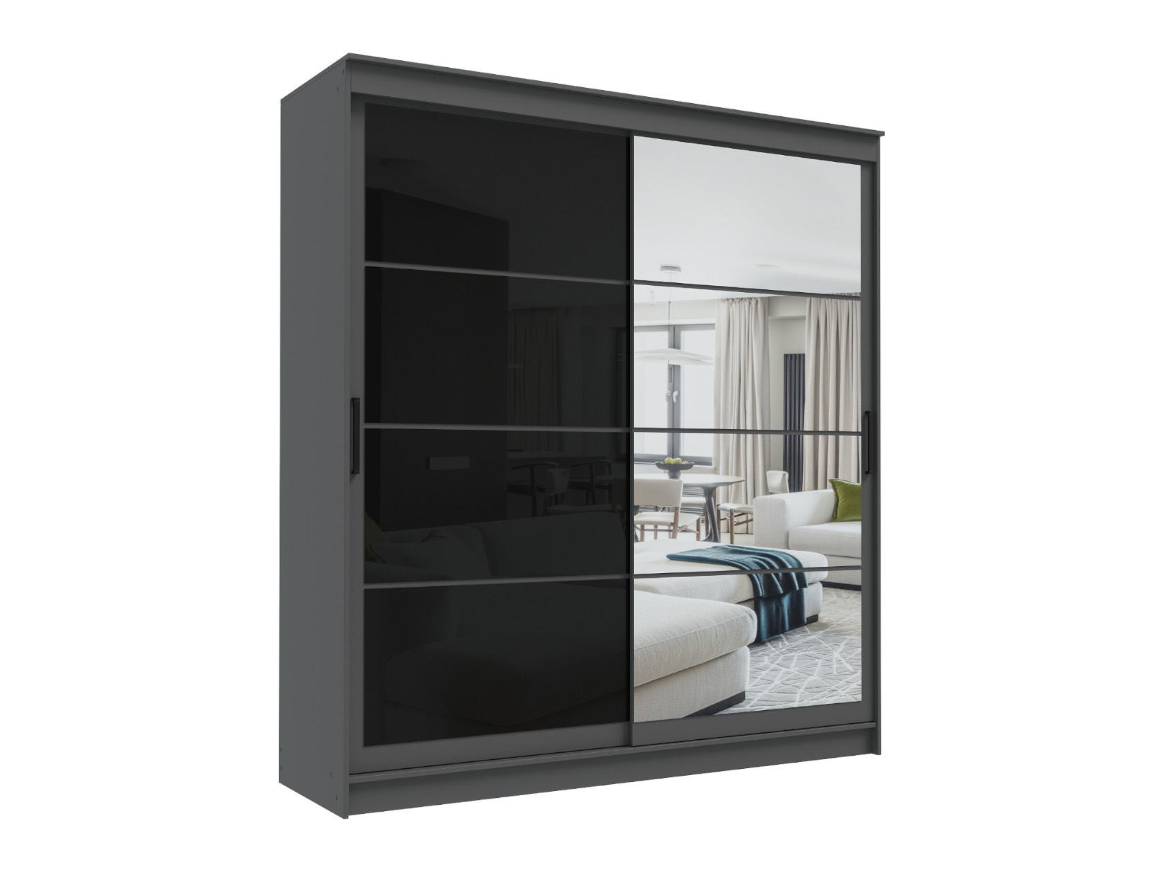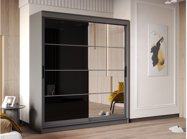 Шкаф-купе Гранд с зеркалом и лакобель черным позволит держать в порядке большое количество вещей. На штангу можно повесить верхнюю одежду, костюмы и платья, а на полках — разместить коробки, предметы быта и сумки. Небольшие выдвижные ящики удобны для аксессуаров и различных мелочей. Вставки на фасадах из черного лакобеля смотрятся стильно и придают мебели привлекательный облик.