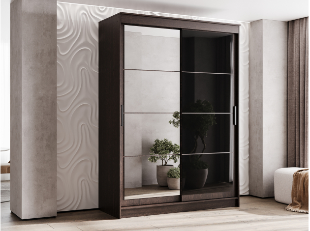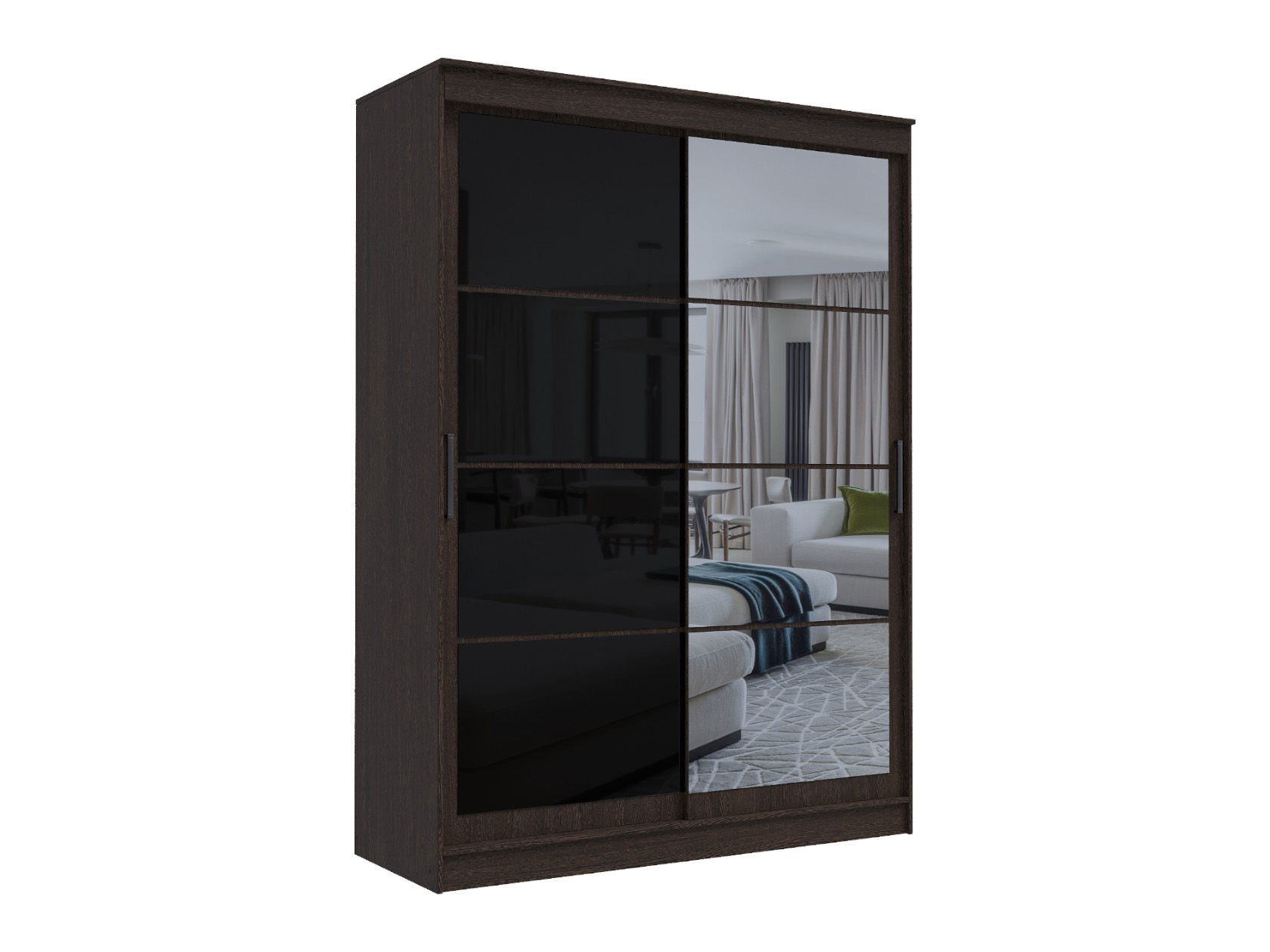 Шкаф-купе Гранд с зеркалом и лакобель черным позволит держать в порядке большое количество вещей. На штангу можно повесить верхнюю одежду, костюмы и платья, а на полках — разместить коробки, предметы быта и сумки. Небольшие выдвижные ящики удобны для аксессуаров и различных мелочей. Вставки на фасадах из черного лакобеля смотрятся стильно и придают мебели привлекательный облик.