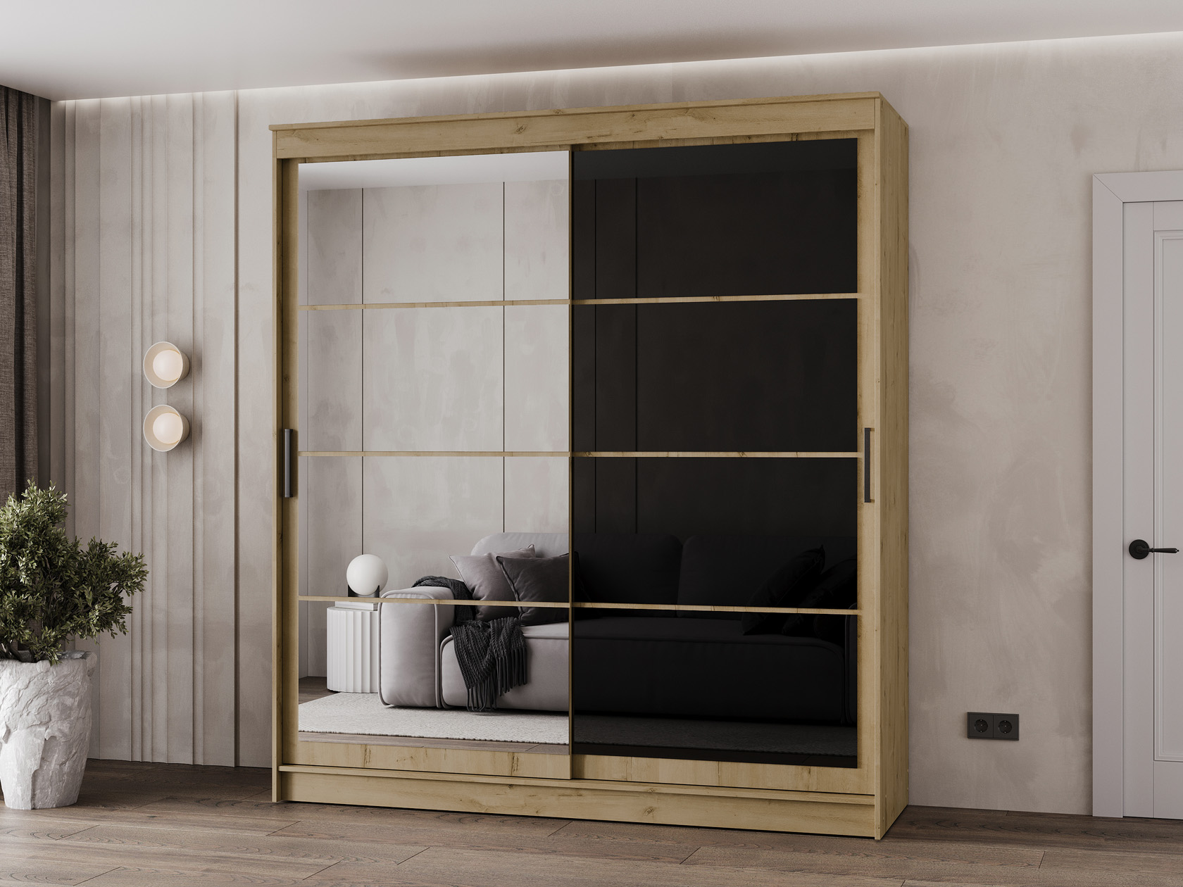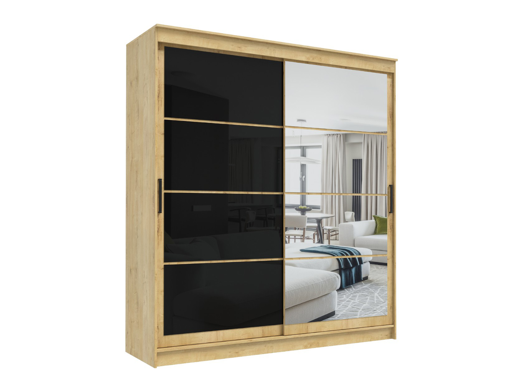 Шкаф-купе Гранд с зеркалом и лакобель черным позволит держать в порядке большое количество вещей. На штангу можно повесить верхнюю одежду, костюмы и платья, а на полках — разместить коробки, предметы быта и сумки. Небольшие выдвижные ящики удобны для аксессуаров и различных мелочей. Вставки на фасадах из черного лакобеля смотрятся стильно и придают мебели привлекательный облик.