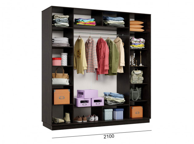 В варианте на ширину 180 см есть 1 боковой отдел с полками. На ширину 210 см боковых отделов с полками 2, по обе стороны. На ширину 240 см боковые отделы заменены на два со штангами, а по центру только один отдел с полками.