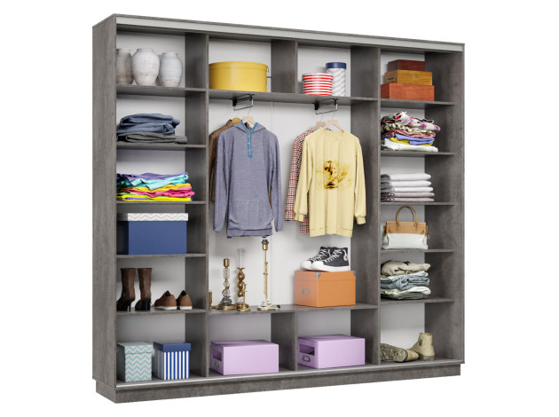 • Вместительный шкаф-купе Маршал Лайт станет основой системы хранения в спальне, прихожей или гостиной. Благодаря штангам можно аккуратно развесить одежду любой длины. Для трикотажа, обуви и аксессуаров предусмотрено множество полок по бокам и в центральной части модели.