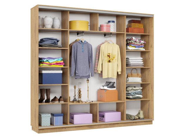 • Вместительный шкаф-купе Маршал Лайт станет основой системы хранения в спальне, прихожей или гостиной. Благодаря штангам можно аккуратно развесить одежду любой длины. Для трикотажа, обуви и аксессуаров предусмотрено множество полок по бокам и в центральной части модели.