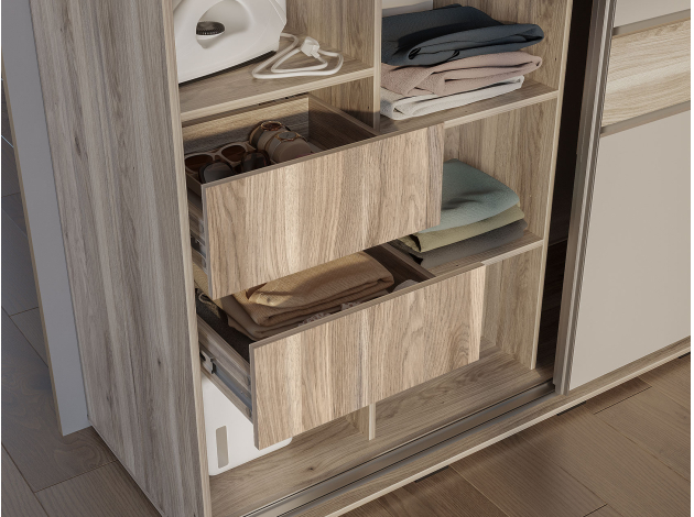 Шкаф-купе Крафт 10 сочетает элегантный внешний вид и функциональность. Модель оснащена просторной секцией со штангой для верхней одежды, а также множеством полок и парой ящиков для комфортного хранения белья и различных мелочей. Раздвижные двери с плавным ходом не занимают места при открывании, что особенно важно для небольших комнат. Трендовый декор с декоративными вставками и натуральные оттенки добавляют интерьеру нотки уюта и естественности.