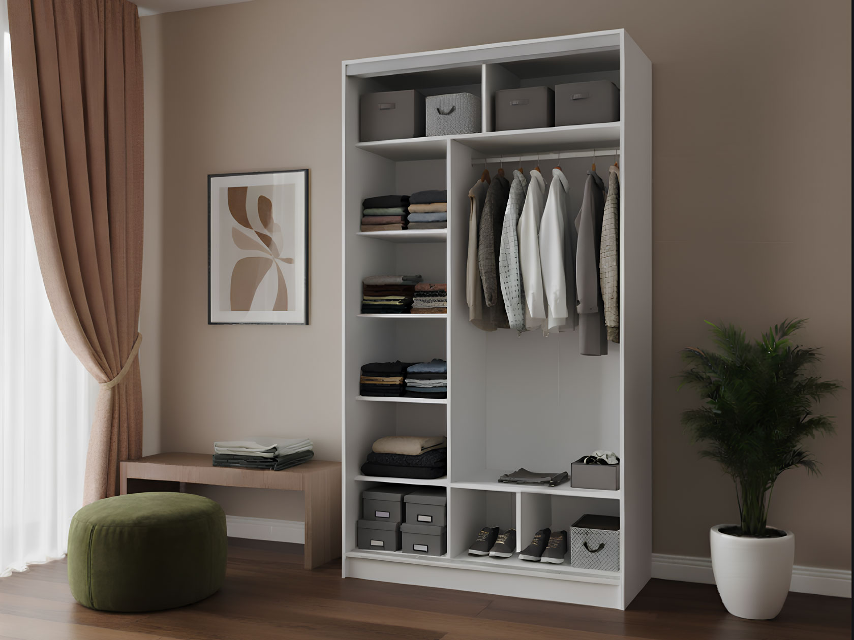 Шкаф-купе Оптима 2 двери — детально продуманное решение для хранения любых необходимых вещей. Наполнение позволяет удобно распределить одежду, белье и аксессуары. Полки со скрытыми держателями можно регулировать по высоте, адаптируя модель под индивидуальные потребности. Минималистичные матовые фасады непритязательны в уходе. Специальный уплотнитель защищает содержимое от пыли и обеспечивает бесшумное закрывание дверей, что особенно важно в спальне или детской.