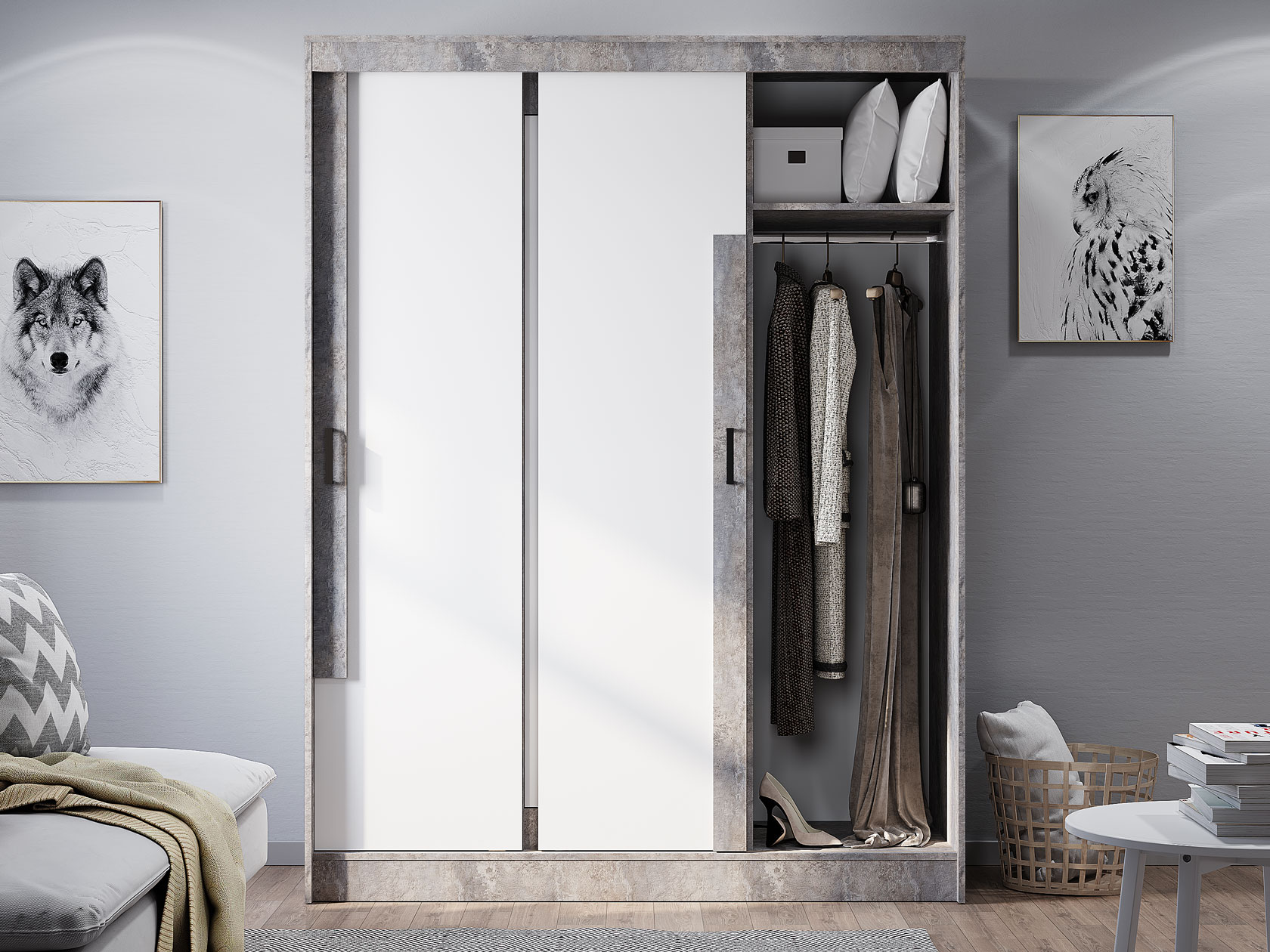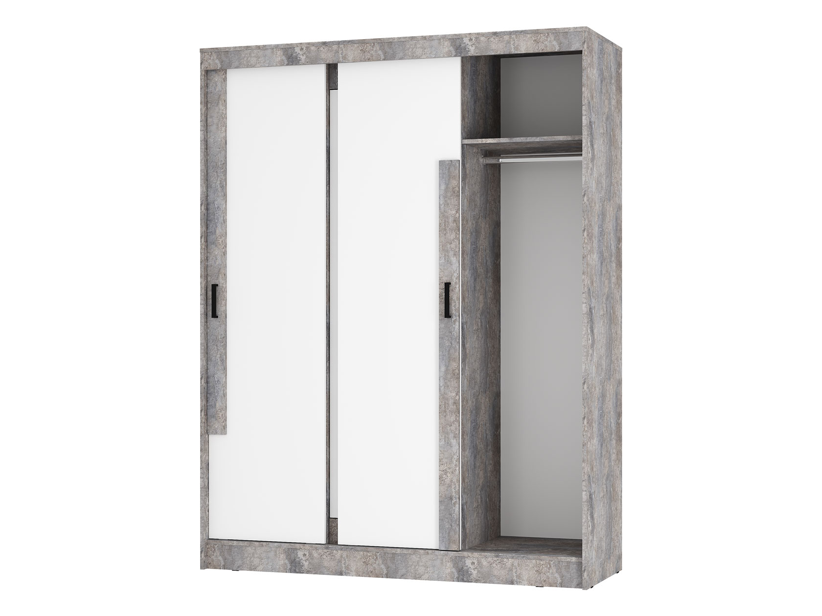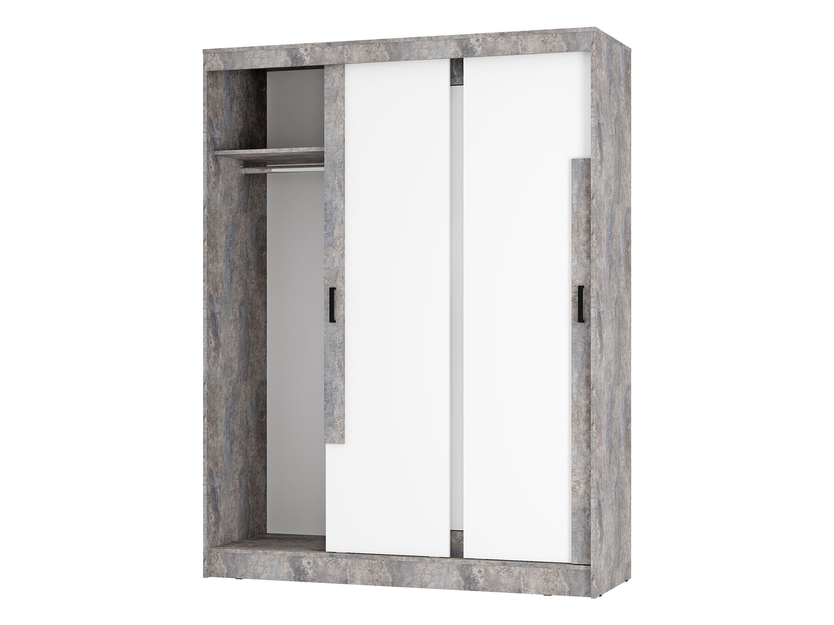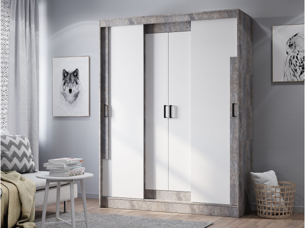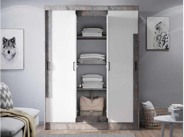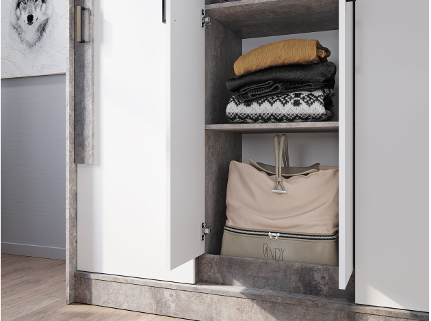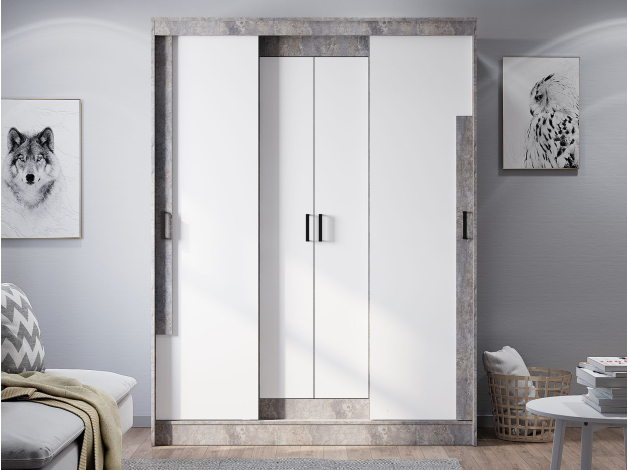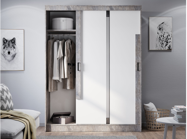 Шкаф-купе Сара — необычное решение для хранения гардероба, которое сочетает две системы открывания дверей: раздвижную и распашную. Это позволяет быстро находить нужную вещь, а также оптимизирует пространство, что очень актуально для небольших помещений. По бокам находятся отделения со штангами для плечиков, а в центре — секция с полками для сложенных предметов гардероба. Сочетание разных текстур смотрится привлекательно и актуально.