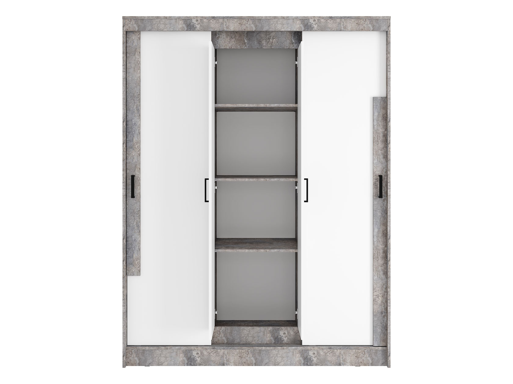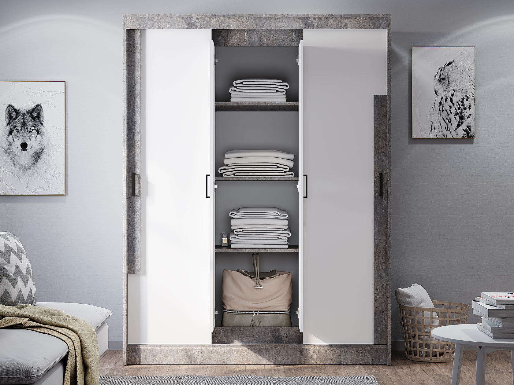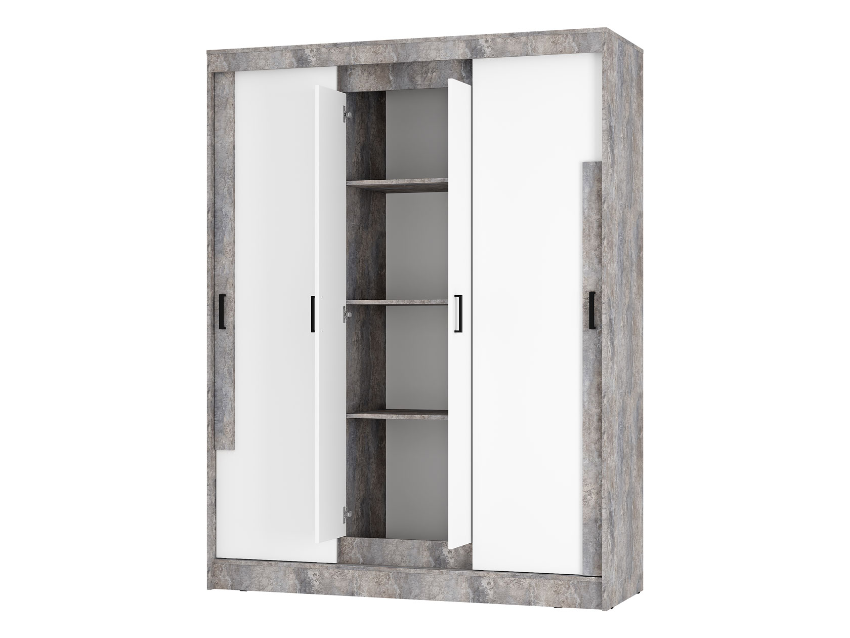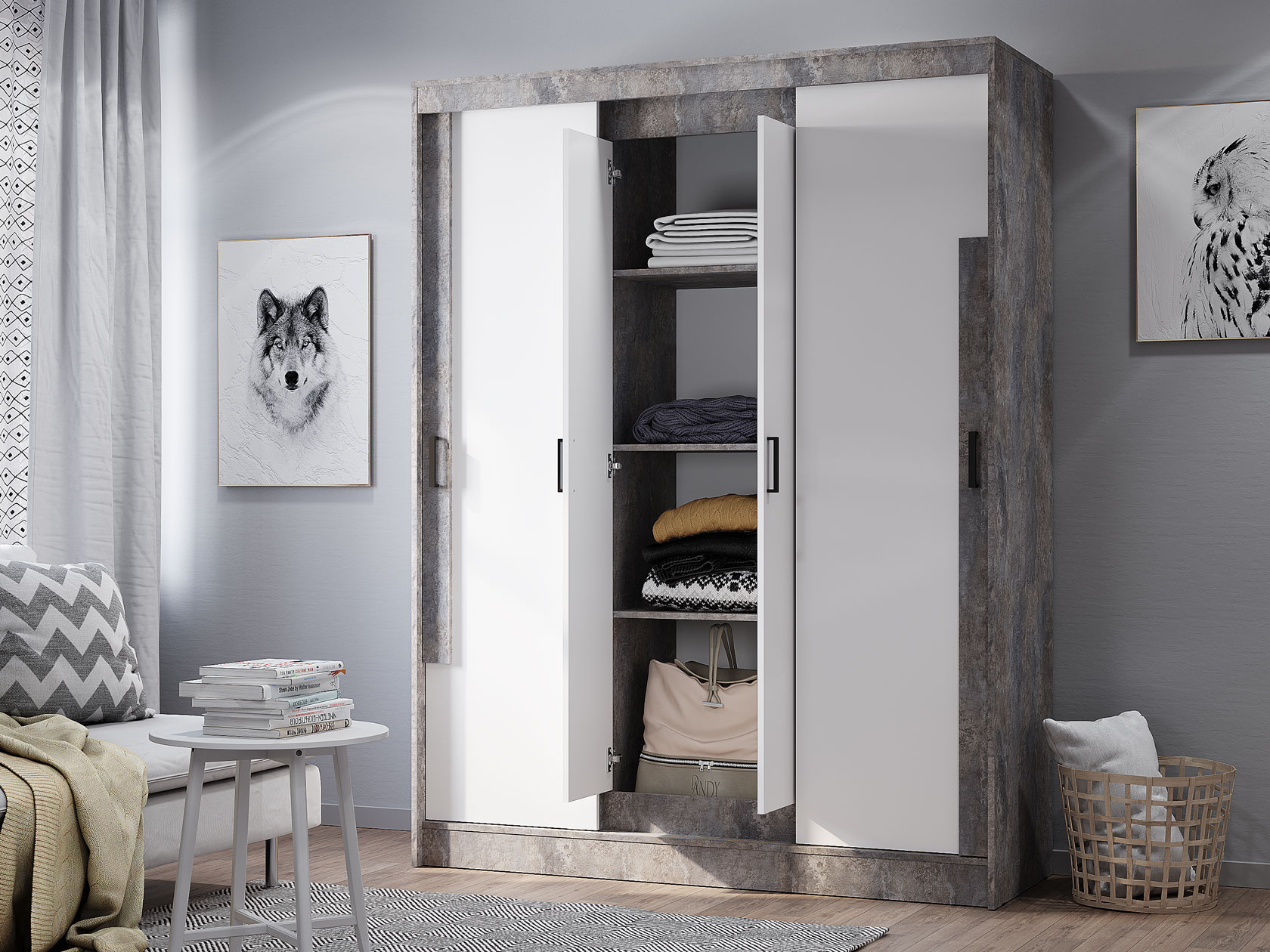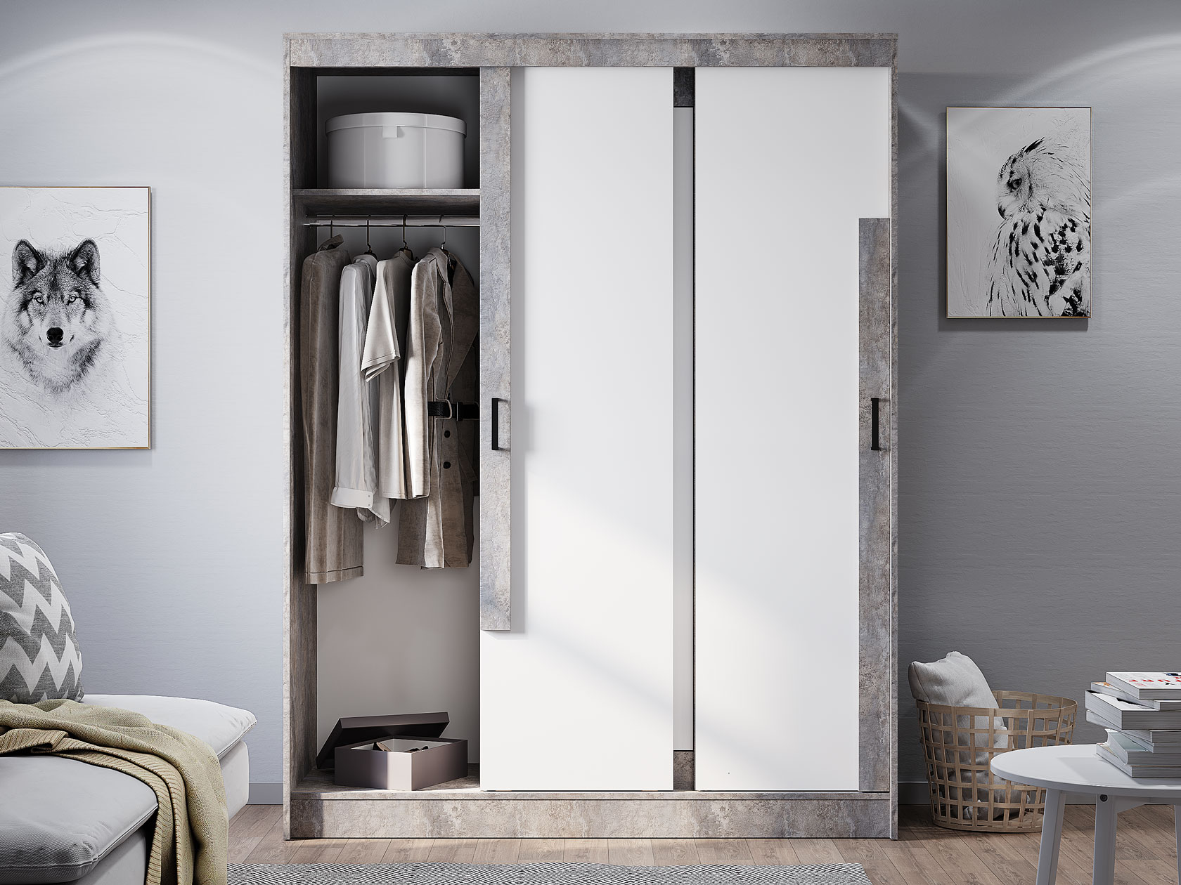 Шкаф-купе Сара — необычное решение для хранения гардероба, которое сочетает две системы открывания дверей: раздвижную и распашную. Это позволяет быстро находить нужную вещь, а также оптимизирует пространство, что очень актуально для небольших помещений. По бокам находятся отделения со штангами для плечиков, а в центре — секция с полками для сложенных предметов гардероба. Сочетание разных текстур смотрится привлекательно и актуально.