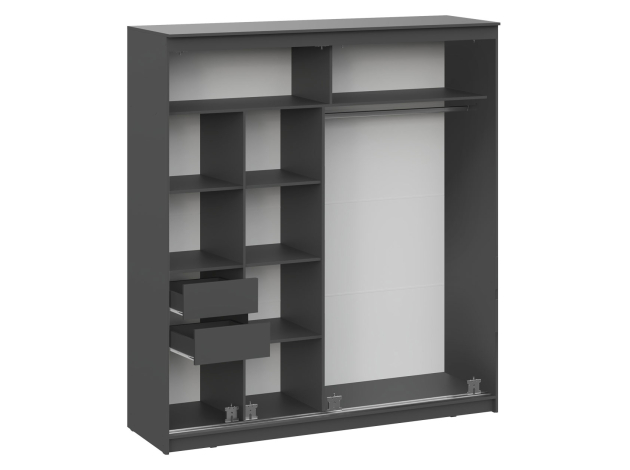 Шкаф-купе Шерри поможет эффективно организовать пространство для хранения одежды, обуви и аксессуаров, а также станет гармоничным дополнением современного интерьера. Внутреннее наполнение шкафа поделено на два равных по размеру отделения, одно из которых оснащено полками и двумя выкатными ящиками, а другое — продольной штангой для вешалок. Правый фасад дополнен зеркальным полотном в полный рост, которое позволит детально оценить подобранный образ и сделает помещение визуально просторнее.
