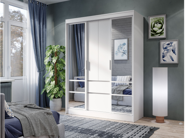 Шкаф-купе Симпл сочетает функциональность, простоту и удобство использования. Важное преимущество модели — наличие зеркал: с ними комната становится визуально объемнее и светлее. Внутри расположены удобные отделения для хранения одежды, обуви и аксессуаров. Модель идеально дополнит современный интерьер спальни, гостиной или прихожей.