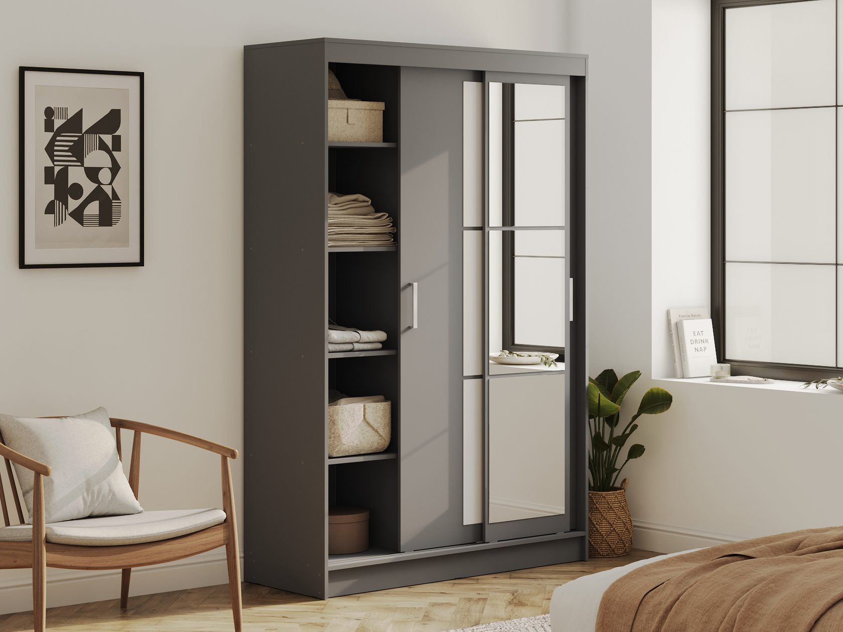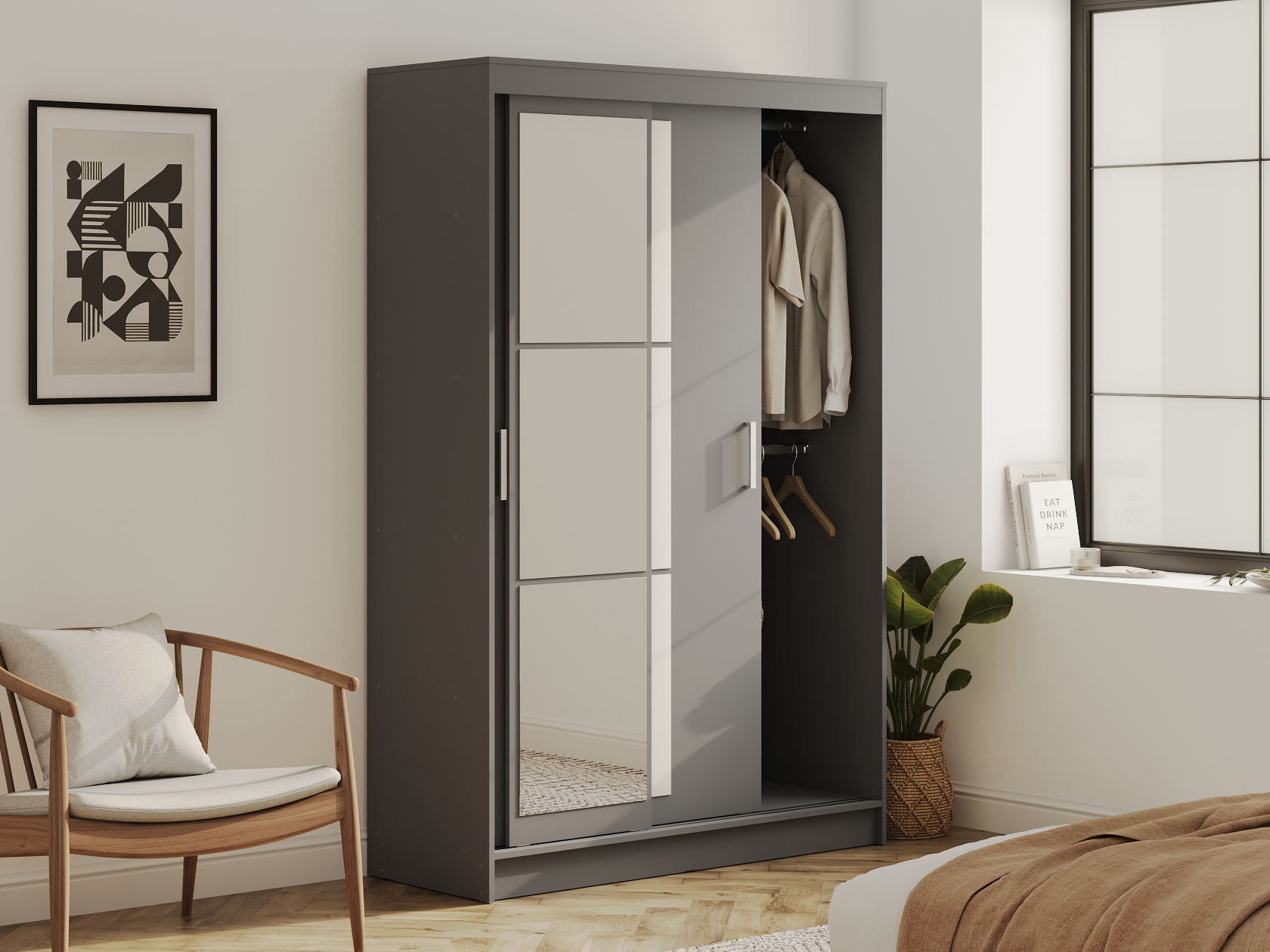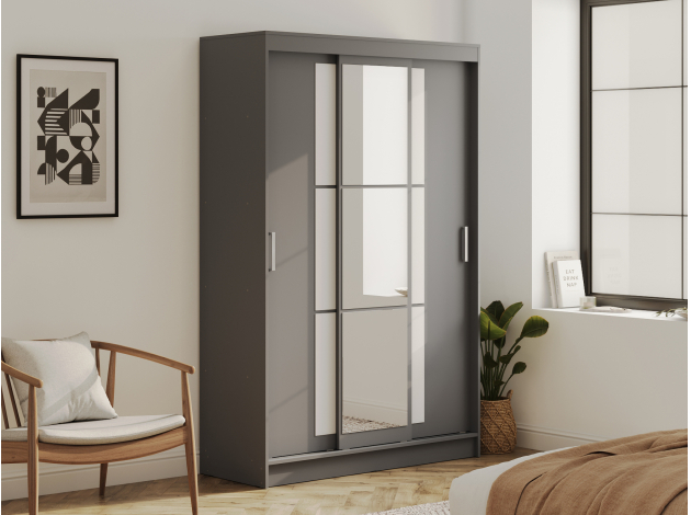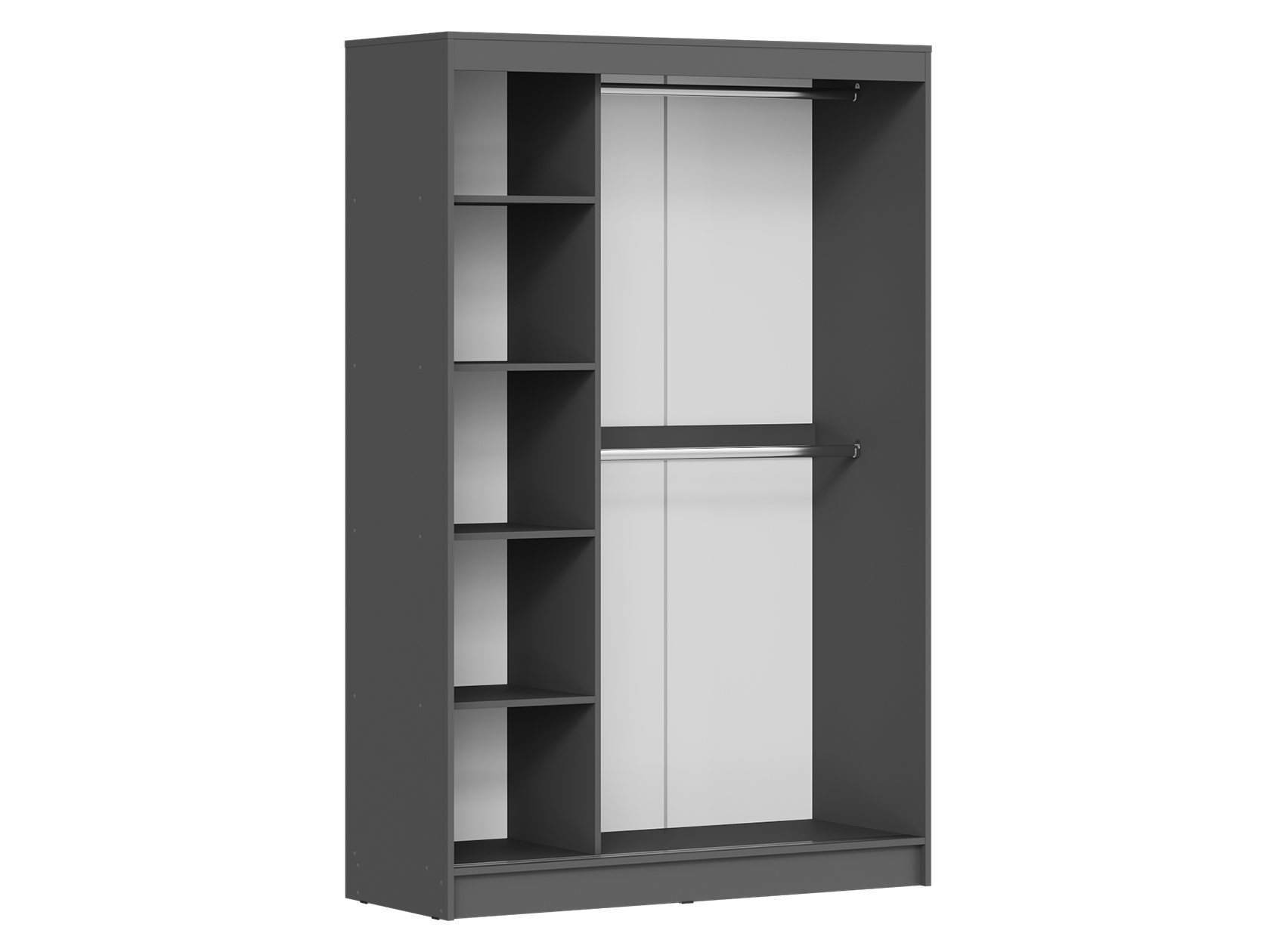 Шкаф-купе Тайм — идеальный способ оформить полноценную зону хранения без лишних затрат пространства. Внутреннее наполнение в виде продольных штанг и полок позволит рационально разместить одежду из деликатных тканей и сложенные предметы гардероба, а внизу можно поставить габаритные вещи. Зеркала визуально расширяют пространство.