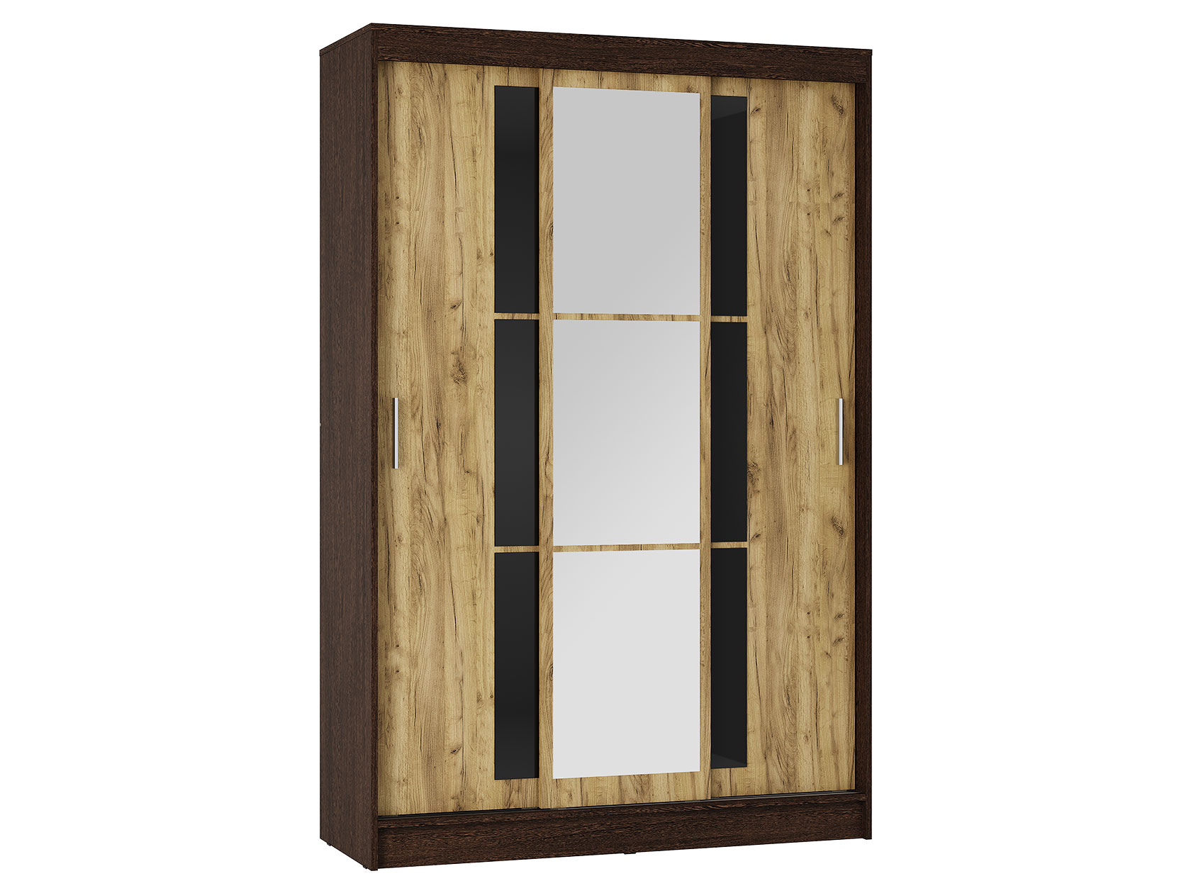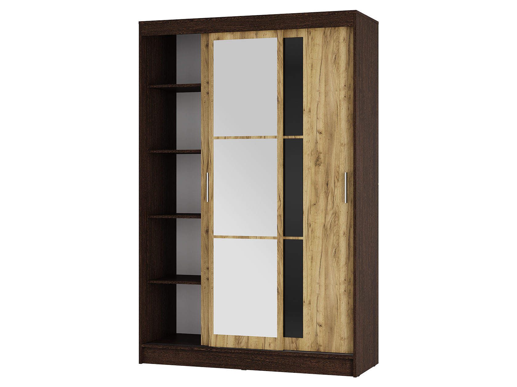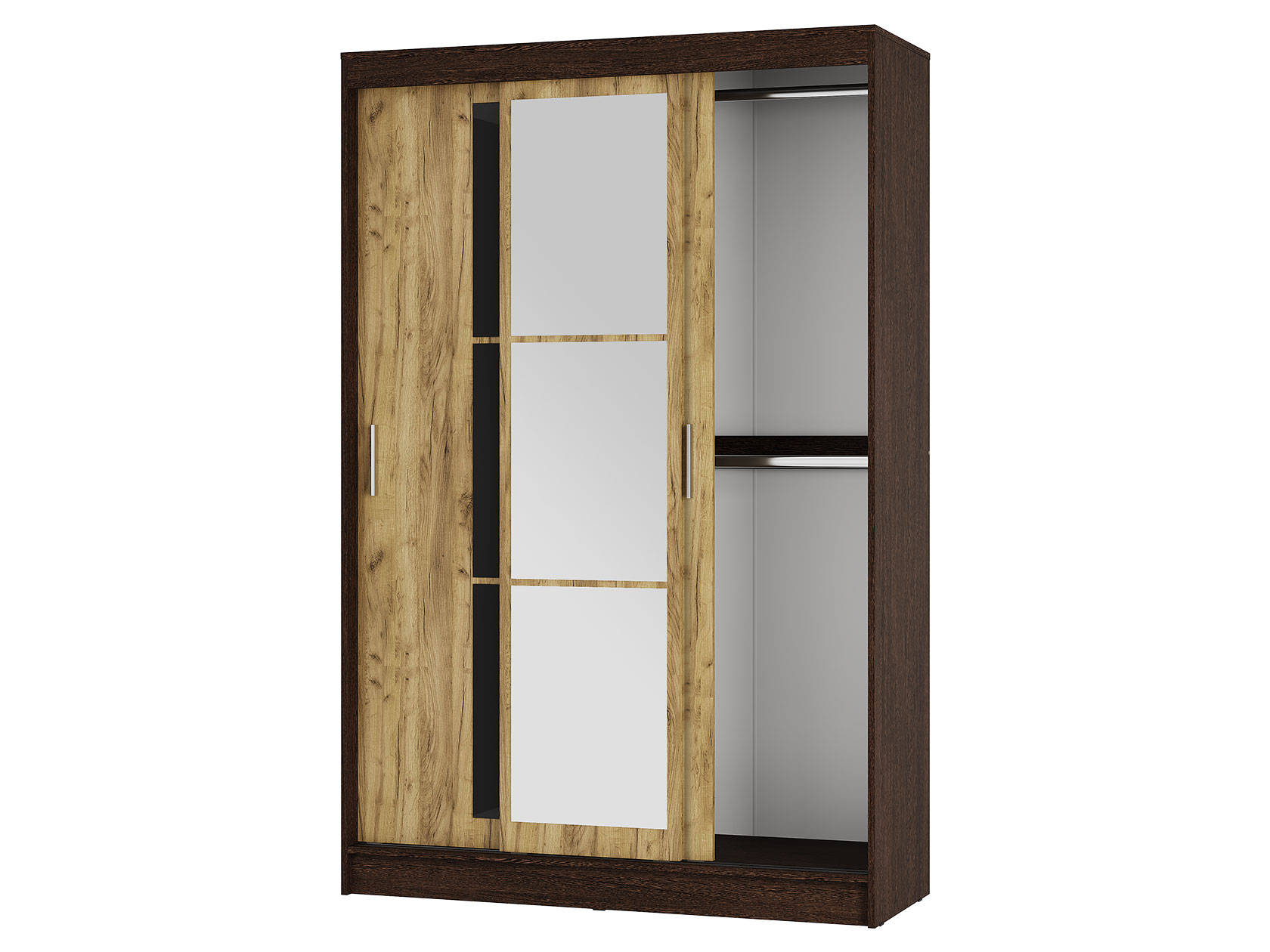 Шкаф-купе Тайм — идеальный способ оформить полноценную зону хранения без лишних затрат пространства. Внутреннее наполнение в виде продольных штанг и полок позволит рационально разместить одежду из деликатных тканей и сложенные предметы гардероба, а внизу можно поставить габаритные вещи. Зеркала визуально расширяют пространство.