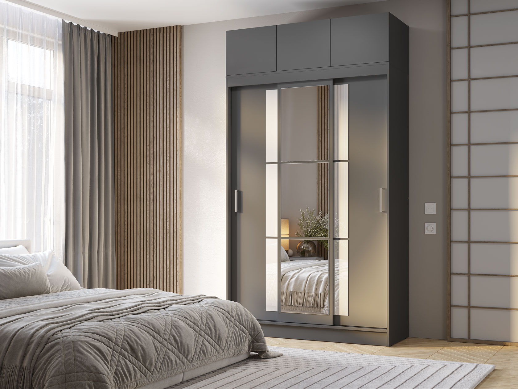 Шкаф-купе Тайм — идеальный способ оформить полноценную зону хранения без лишних затрат пространства. Внутреннее наполнение в виде продольных штанг и полок позволит рационально разместить одежду из деликатных тканей и сложенные предметы гардероба, а внизу можно поставить габаритные вещи. Зеркала визуально расширяют пространство.