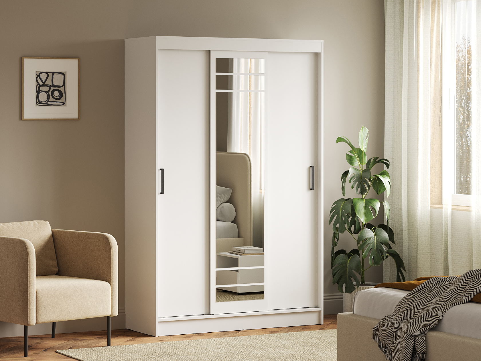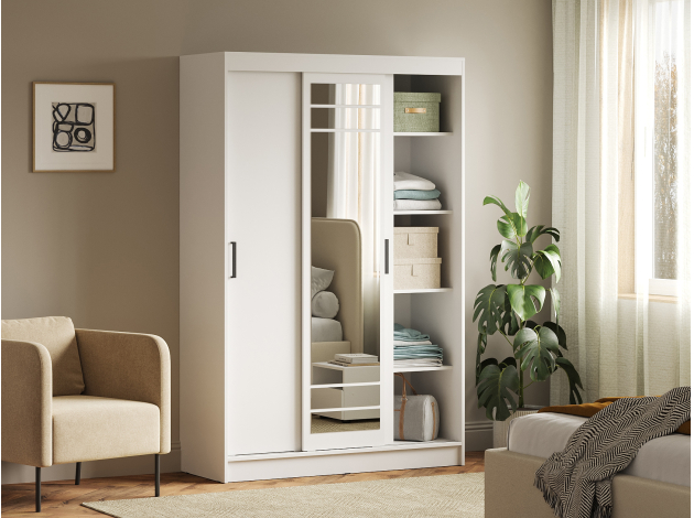 Шкаф-купе Тео — практичный вариант для хранения, который гармонично дополнит современный интерьер. Раздвижные дверцы не требуют дополнительного пространства при открывании, поэтому модель добавит функционала даже комнате, где площадь ограничена. Внутри можно с комфортом разместить одежду на плечиках и в сложенном виде. Высокое зеркало позволит рассмотреть свое отражение в полный рост.