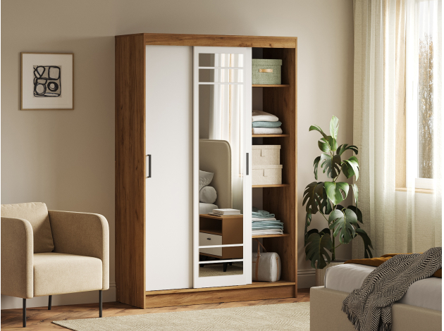 Шкаф-купе Тео — практичный вариант для хранения, который гармонично дополнит современный интерьер. Раздвижные дверцы не требуют дополнительного пространства при открывании, поэтому модель добавит функционала даже комнате, где площадь ограничена. Внутри можно с комфортом разместить одежду на плечиках и в сложенном виде. Высокое зеркало позволит рассмотреть свое отражение в полный рост.