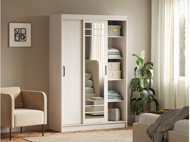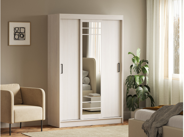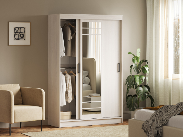 Шкаф-купе Тео — практичный вариант для хранения, который гармонично дополнит современный интерьер. Раздвижные дверцы не требуют дополнительного пространства при открывании, поэтому модель добавит функционала даже комнате, где площадь ограничена. Внутри можно с комфортом разместить одежду на плечиках и в сложенном виде. Высокое зеркало позволит рассмотреть свое отражение в полный рост.