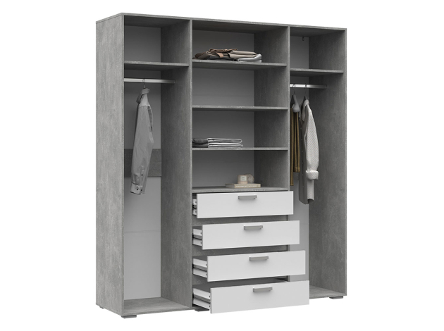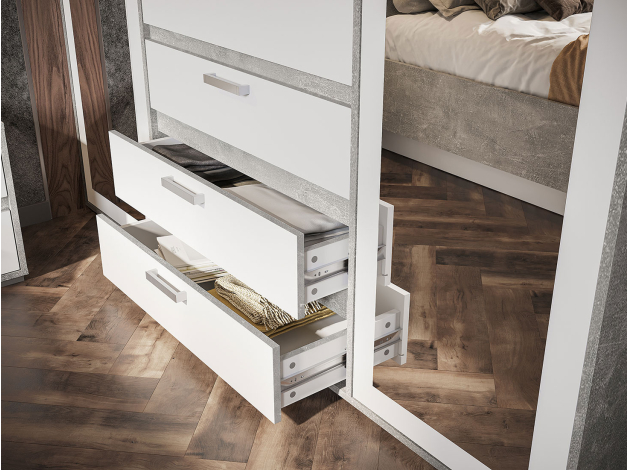Дизайн и конструкция распашного шкафа Амбер продуманы до мельчайших деталей. Комбинированное наполнение с широкими полками и ящиками, а также двумя нишами для вешалок — оптимальный вариант для хранения предметов гардероба и других нужных вещей. Зеркала на фасадах — еще одно преимущество модели: помимо основной функции, они делают комнату визуально светлее и просторнее.