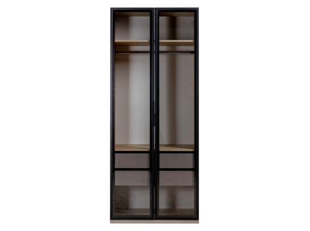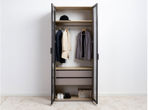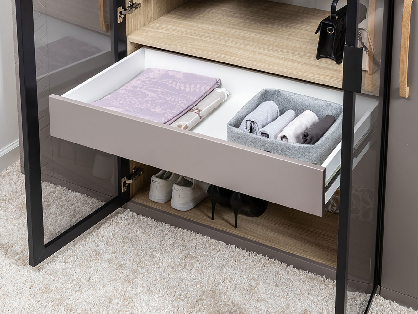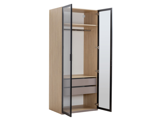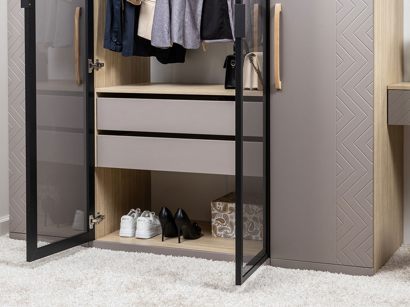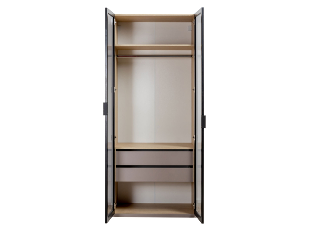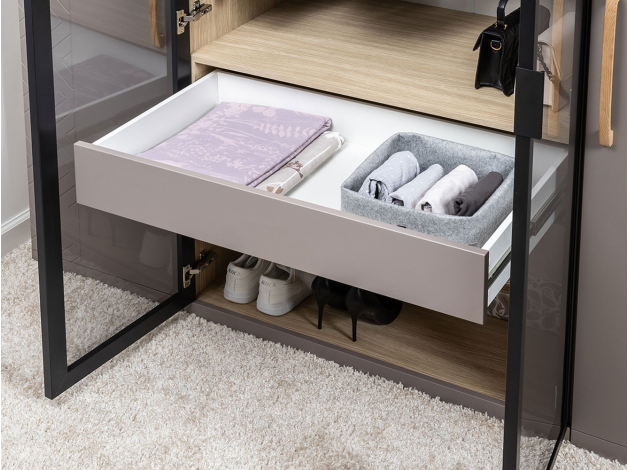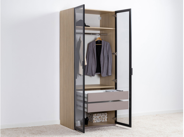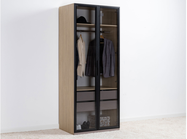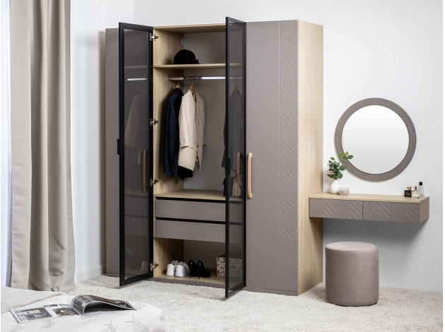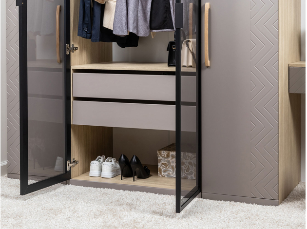 Распашной шкаф Амьен станет стильным акцентом комнаты. Дверцы выполнены из затемненного стекла, что обеспечивает элегантное хранение предметов гардероба и личных вещей. На полках можно разместить футболки, джинсы и аксессуары. Выдвижные ящики подходят для разных мелочей, которые нужно спрятать.