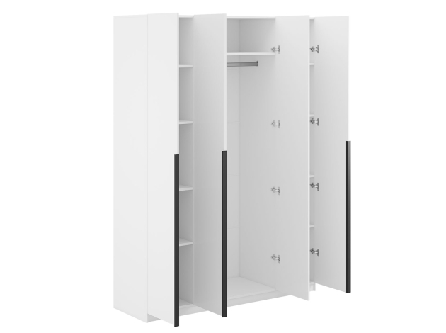 Распашной шкаф Арно 4 двери — вместительная модель, с которой легко организовать максимально удобную систему хранения. Можно выбрать один из двух вариантов наполнения: с просторной нишей по центру или с ящиками для белья и аксессуаров. В дизайне сделан акцент на простую геометрию, которую подчеркивают тонкие контрастные ручки.