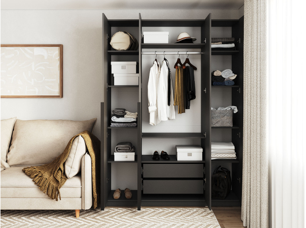 Распашной шкаф Арно 4 двери — вместительная модель, с которой легко организовать максимально удобную систему хранения. Можно выбрать один из двух вариантов наполнения: с просторной нишей по центру или с ящиками для белья и аксессуаров. В дизайне сделан акцент на простую геометрию, которую подчеркивают тонкие контрастные ручки.