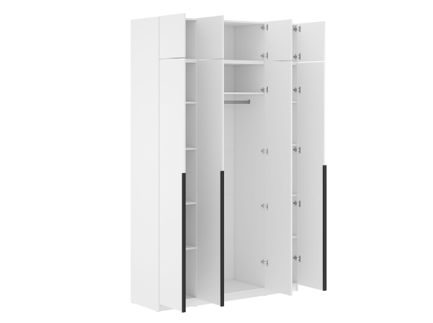 Распашной шкаф Арно 4 двери — вместительная модель, с которой легко организовать максимально удобную систему хранения. Можно выбрать один из двух вариантов наполнения: с просторной нишей по центру или с ящиками для белья и аксессуаров. В дизайне сделан акцент на простую геометрию, которую подчеркивают тонкие контрастные ручки.