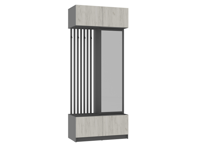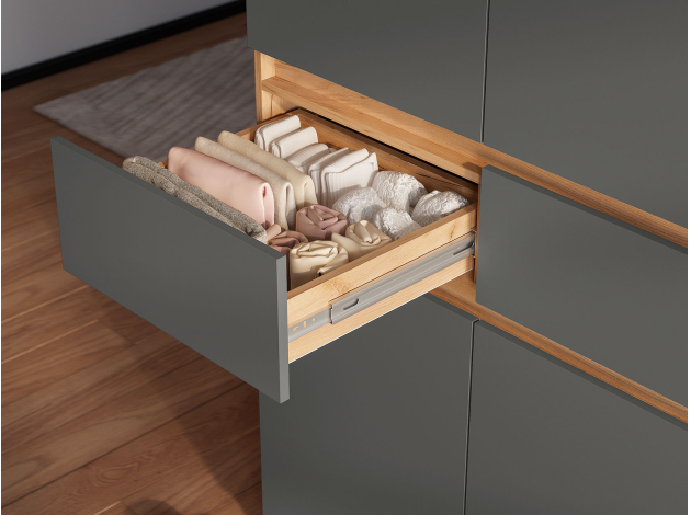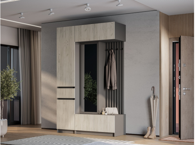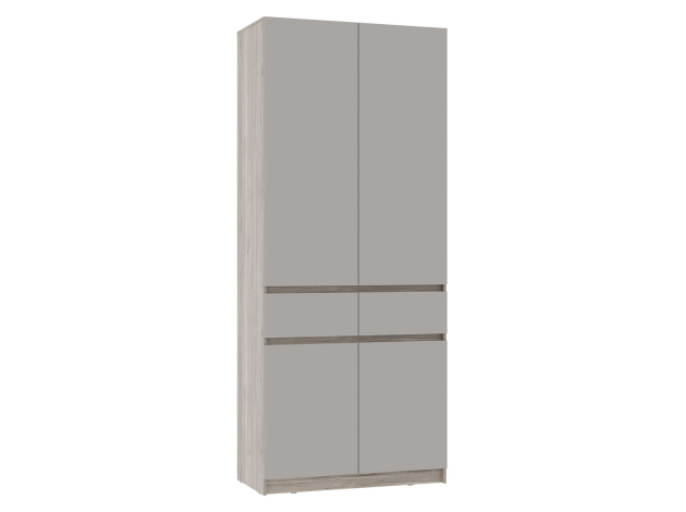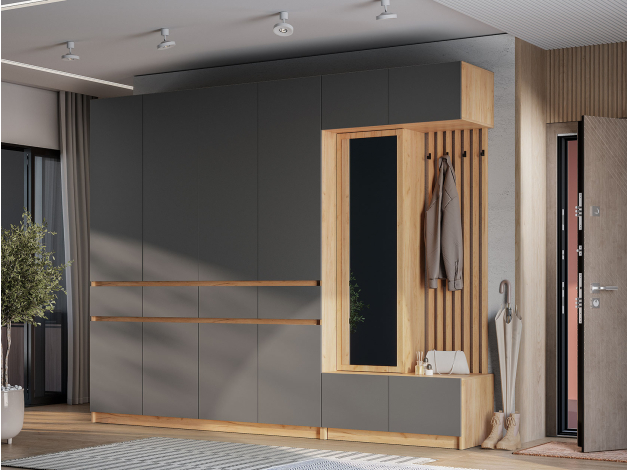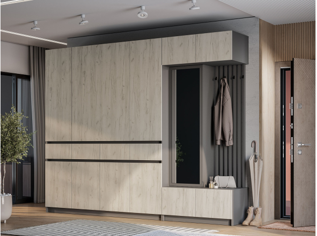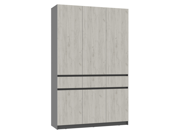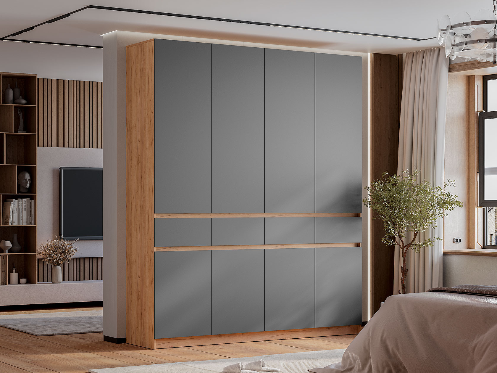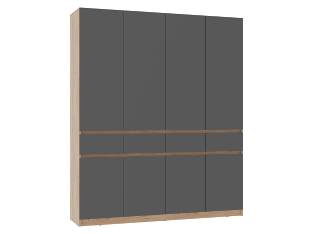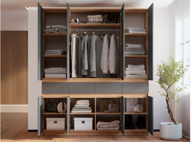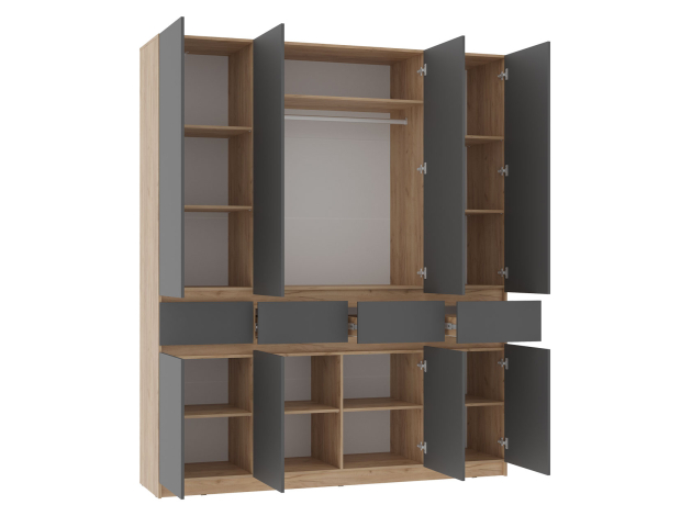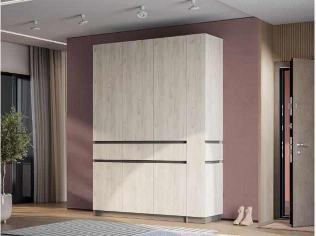 Распашной шкаф Багира Макси организует продуманную систему хранения гардероба. Внутри есть отделение с продольной штангой, несколько закрытых секций с полками и ряд выдвижных ящиков, чтобы держать в быстром доступе полезные мелочи. Дверцы без внешней фурнитуры открываются за край створки. Минималистичный дизайн не перегружает интерьер лишними деталями и облегчает уход за мебелью.