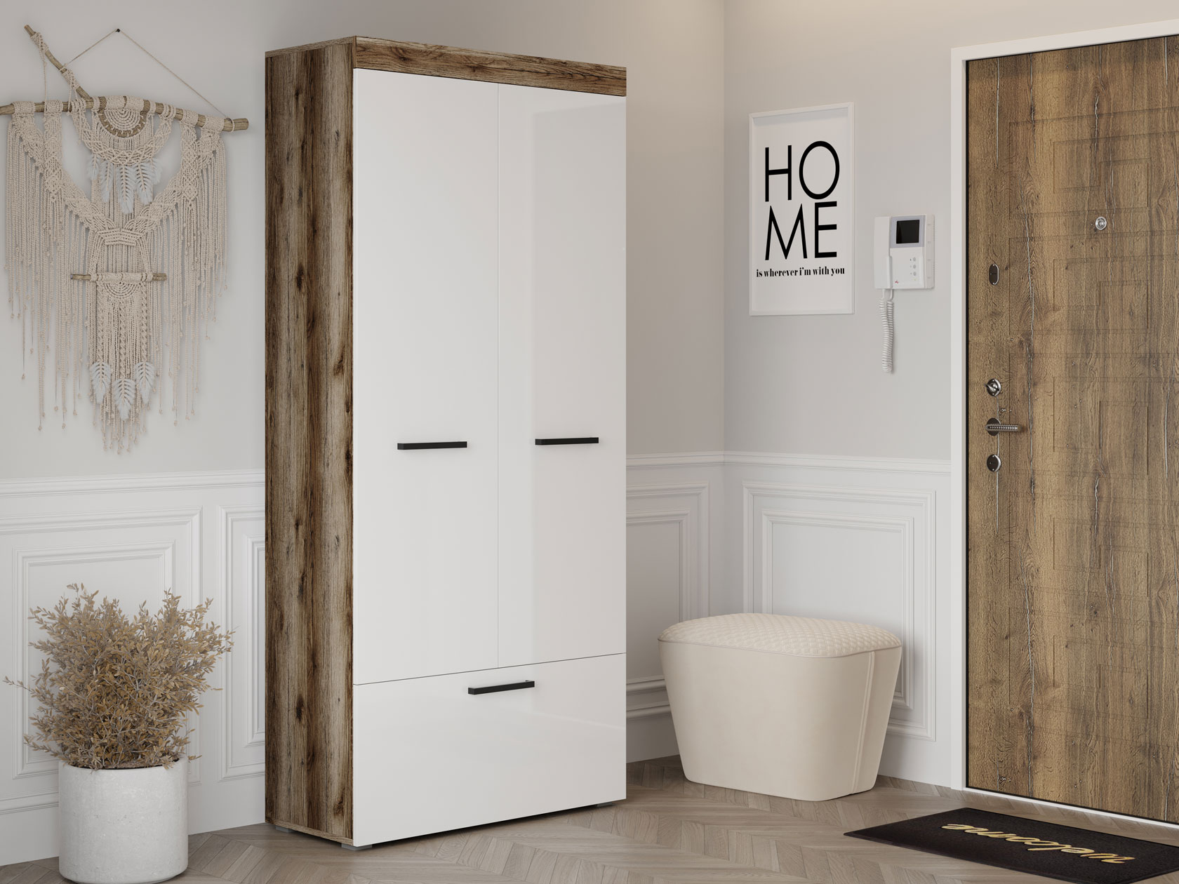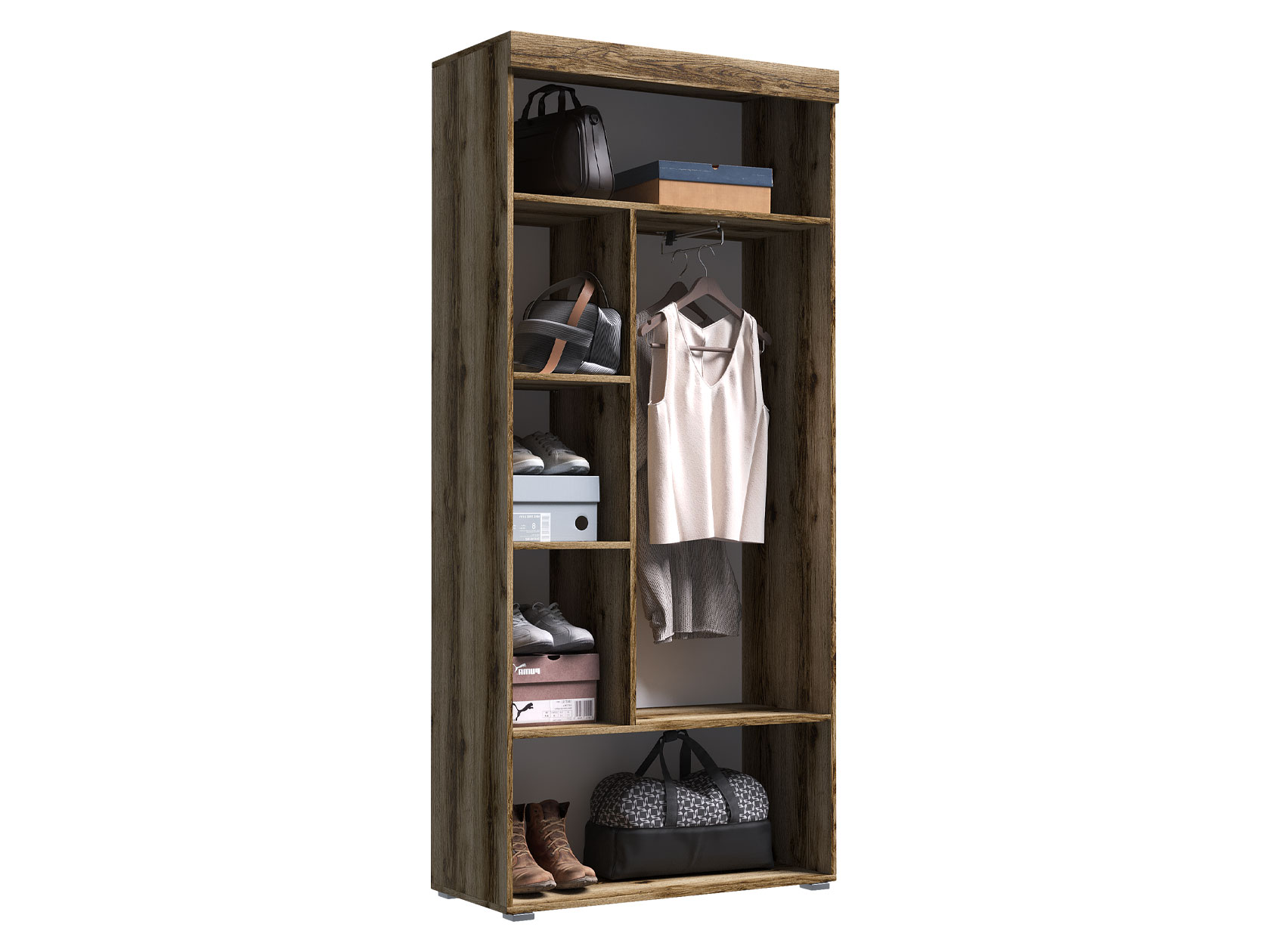 Распашной шкаф Бастон станет элегантным дополнением гостиной, спальни или прихожей. Современный дизайн позволяет адаптировать модель под любой интерьер. Евроштанга разместит одежду из деликатных тканей, а на полках удобно хранить вещи в сложенном виде.