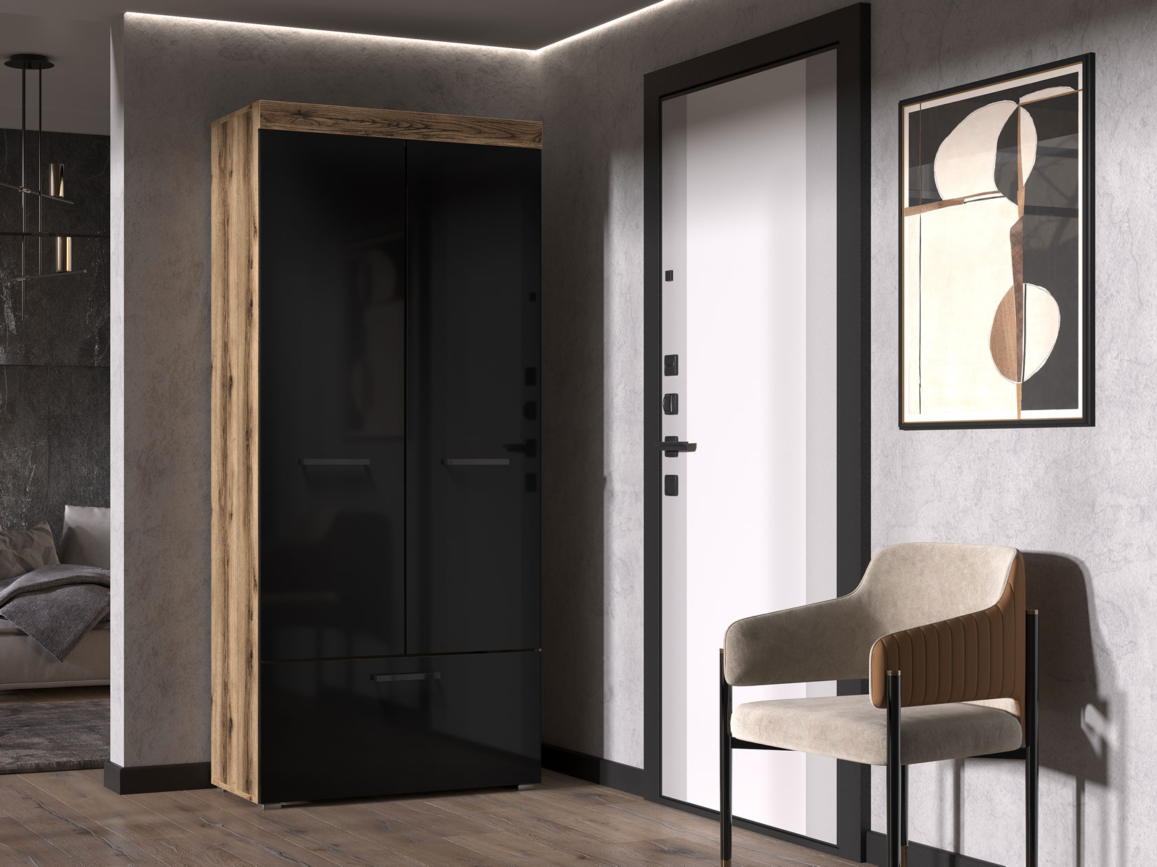 Распашной шкаф Бастон станет элегантным дополнением гостиной, спальни или прихожей. Современный дизайн позволяет адаптировать модель под любой интерьер. Евроштанга разместит одежду из деликатных тканей, а на полках удобно хранить вещи в сложенном виде.