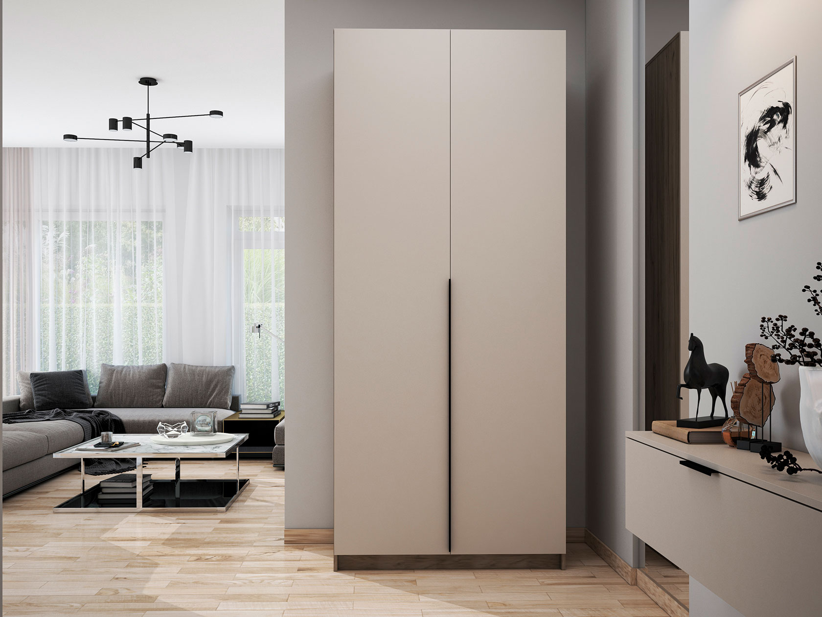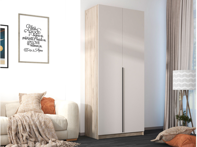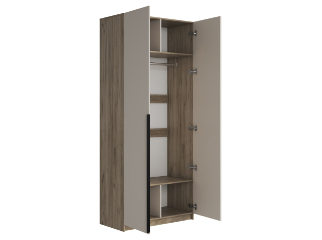 Распашной шкаф Бохо позволит создать аккуратную систему хранения предметов гардероба. Внутреннее пространство представлено отделением со штангой, где удобно расположить платья, костюмы и пиджаки. На полках найдется место для футболок, джинсов и текстиля. Лаконичная фурнитура в виде черной матовой ручки гармонично адаптируется под современный интерьер.