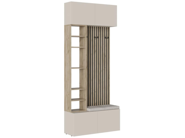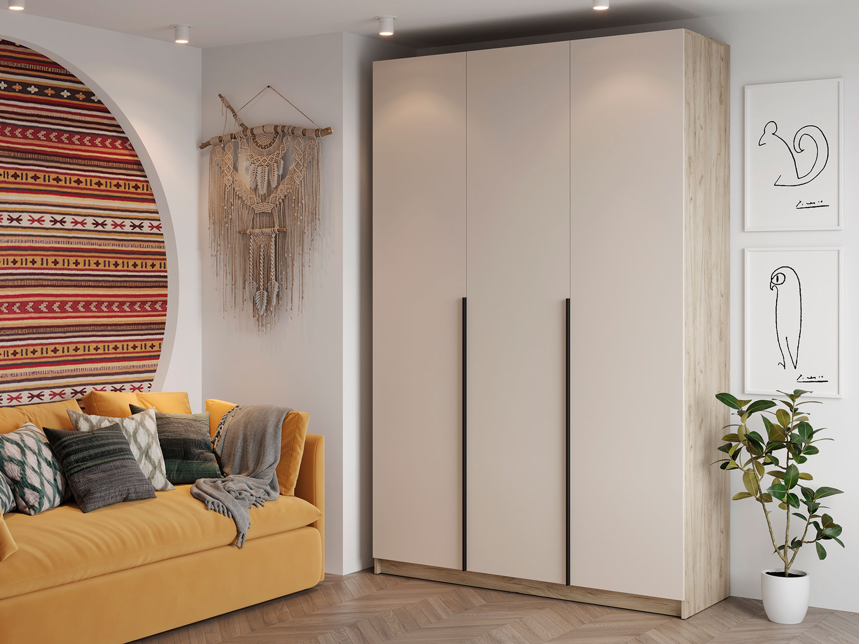 Распашной шкаф Бохо позволит аккуратно развесить одежду любой длины. На антресольных полках можно разместить сезонные вещи, а внизу — коробки с обувью. В дизайне нет лишних деталей, поэтому модель отлично сочетается с разными стилями меблировки.