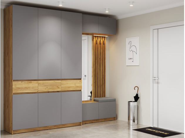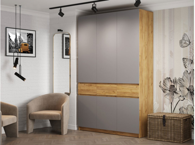 Распашной шкаф Бостон гармонично дополнит современный интерьер и расширит домашнюю систему хранения. Внутри имеются вместительная секция со штангой для плечиков и полки, которые разместят рубашки, платья и сезонные вещи. Выдвижные ящики подойдут для полезных мелочей, а закрытые ниши — для обуви. Фасады не имеют ручек и открываются при помощи зазоров, скрытых за декоративными планками.
