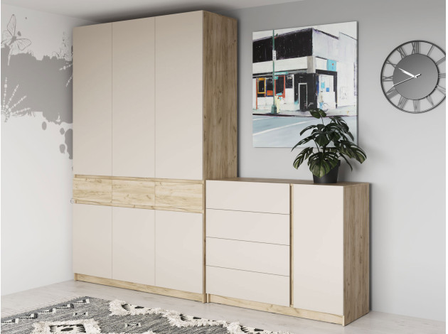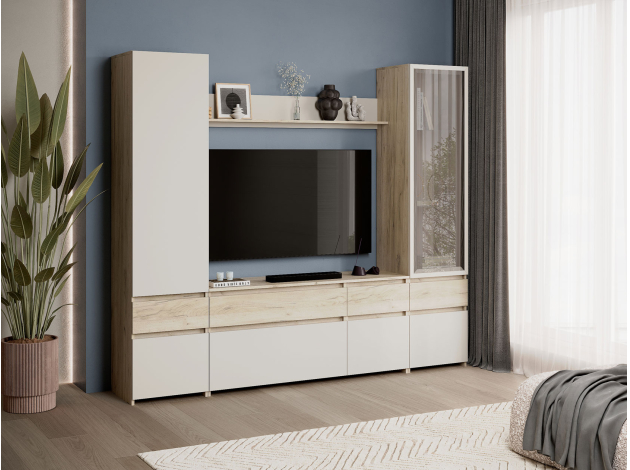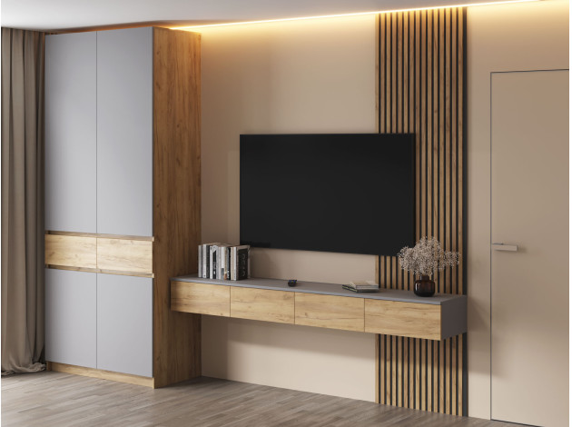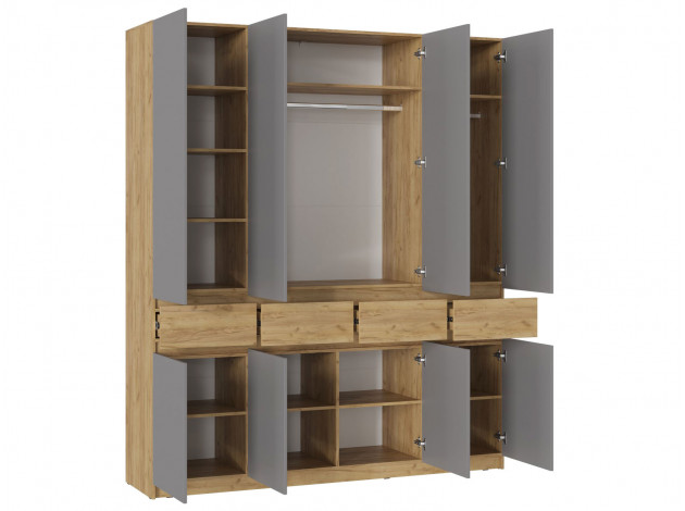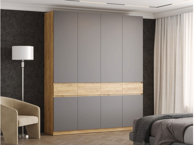 Распашной шкаф Бостон организует продуманную систему хранения гардероба в современном интерьере, рационально используя пространство. Комбинированное наполнение представлено двумя отделениями со штангами для вешалок, множеством полок для сложенной одежды и сезонной обуви, а также выдвижными ящиками, где удобно держать в быстром доступе полезные мелочи. Ящики оснащены шариковыми направляющими для плавного бесшумного хода. Дверцы без внешней фурнитуры открываются при помощи зазоров на фасадах, скрытых за декоративными планками.