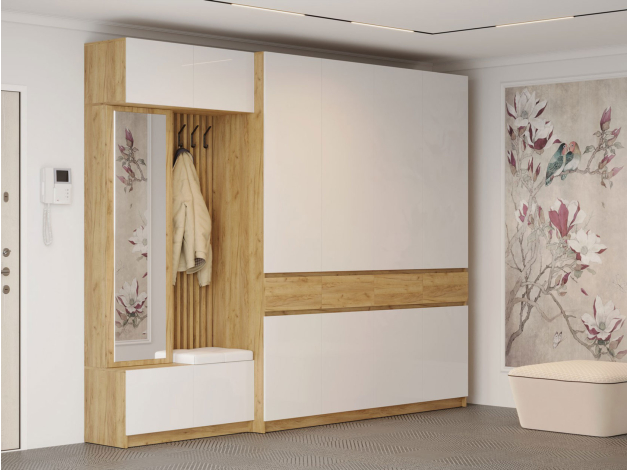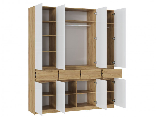 Распашной шкаф Бостон организует продуманную систему хранения гардероба в современном интерьере, рационально используя пространство. Комбинированное наполнение представлено двумя отделениями со штангами для вешалок, множеством полок для сложенной одежды и сезонной обуви, а также выдвижными ящиками, где удобно держать в быстром доступе полезные мелочи. Ящики оснащены шариковыми направляющими для плавного бесшумного хода. Дверцы без внешней фурнитуры открываются при помощи зазоров на фасадах, скрытых за декоративными планками.